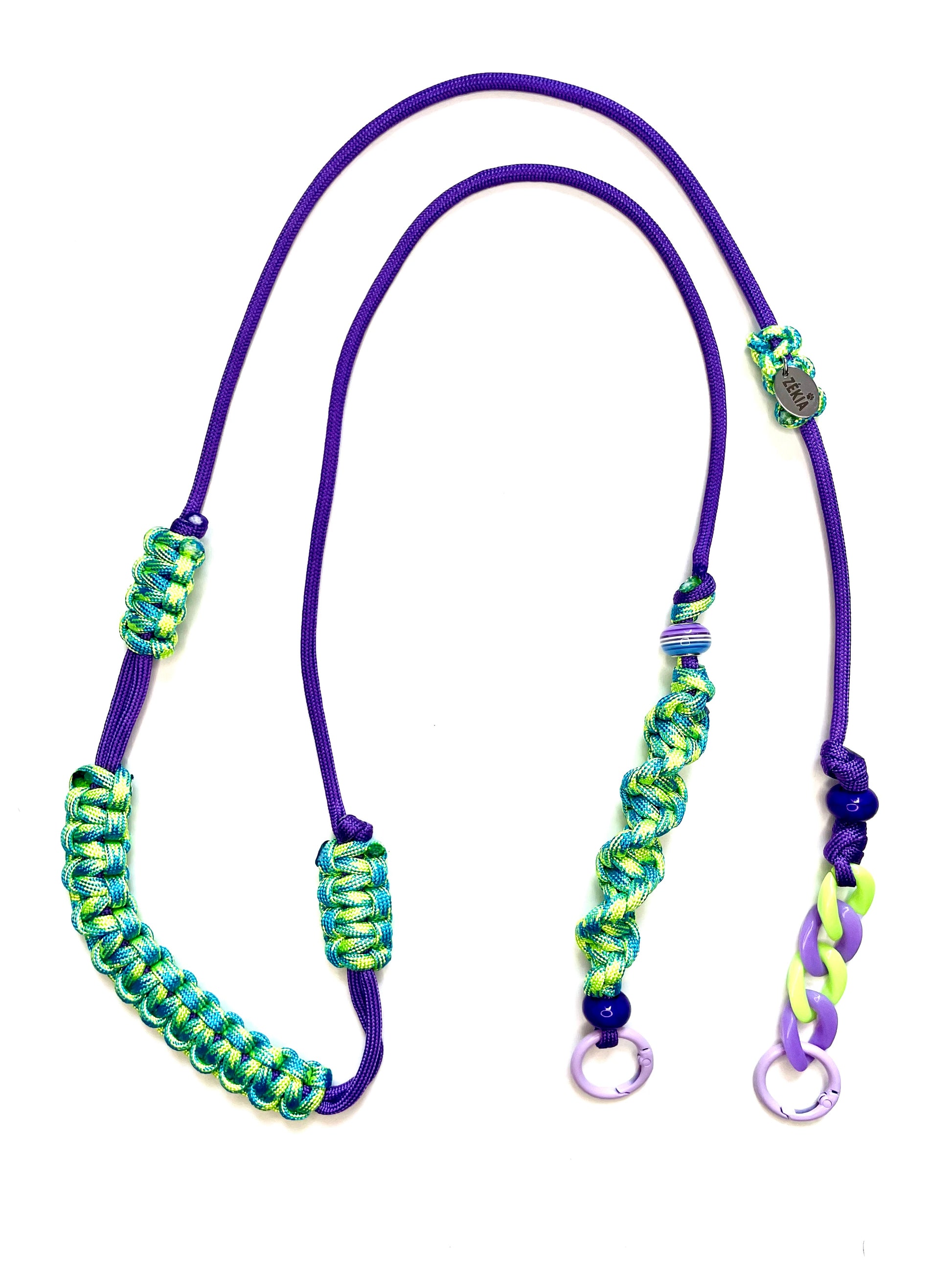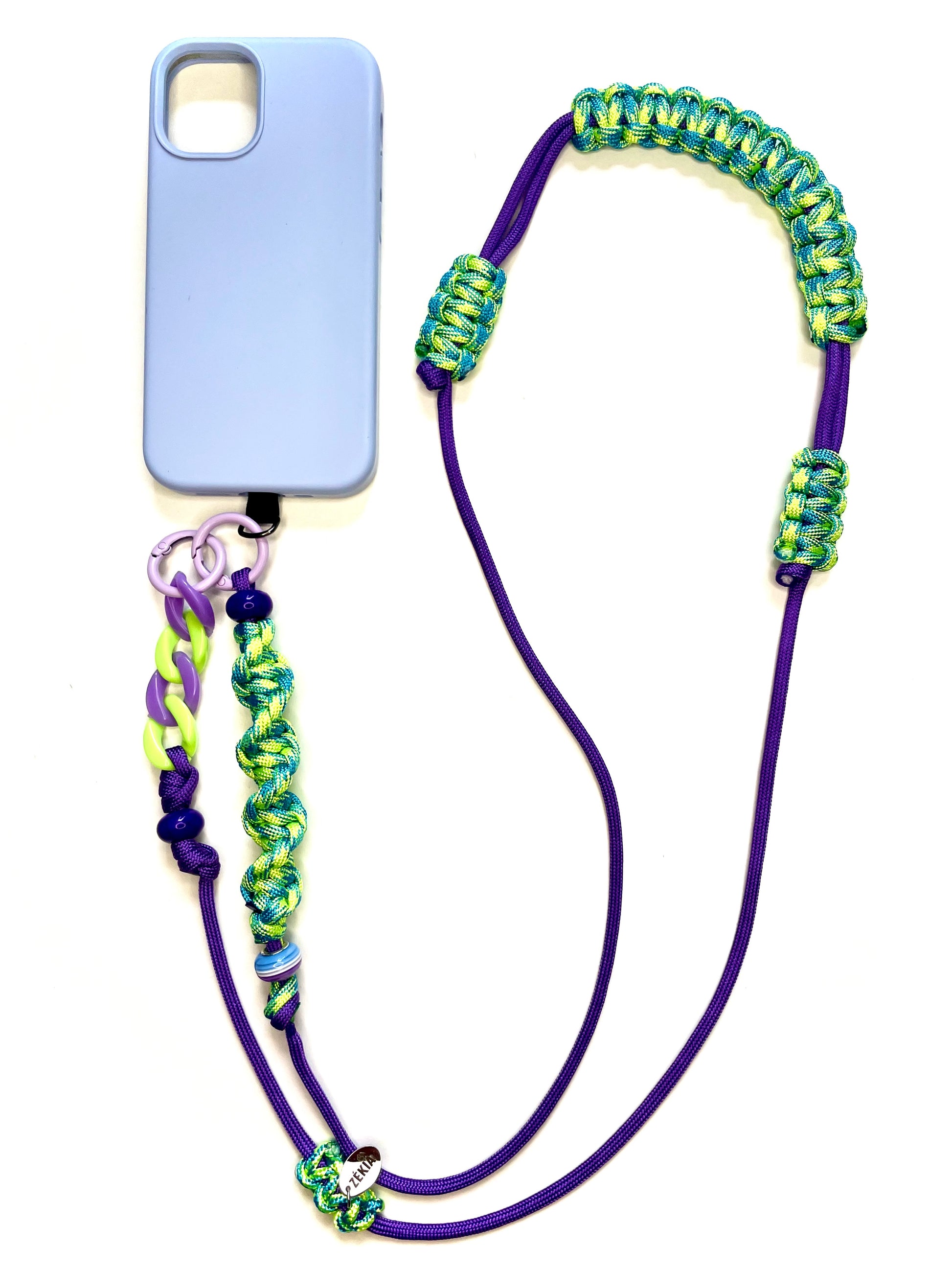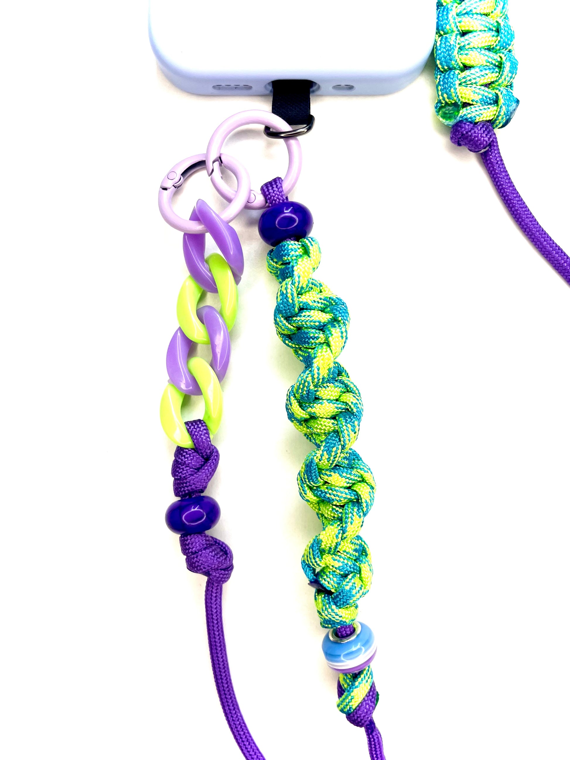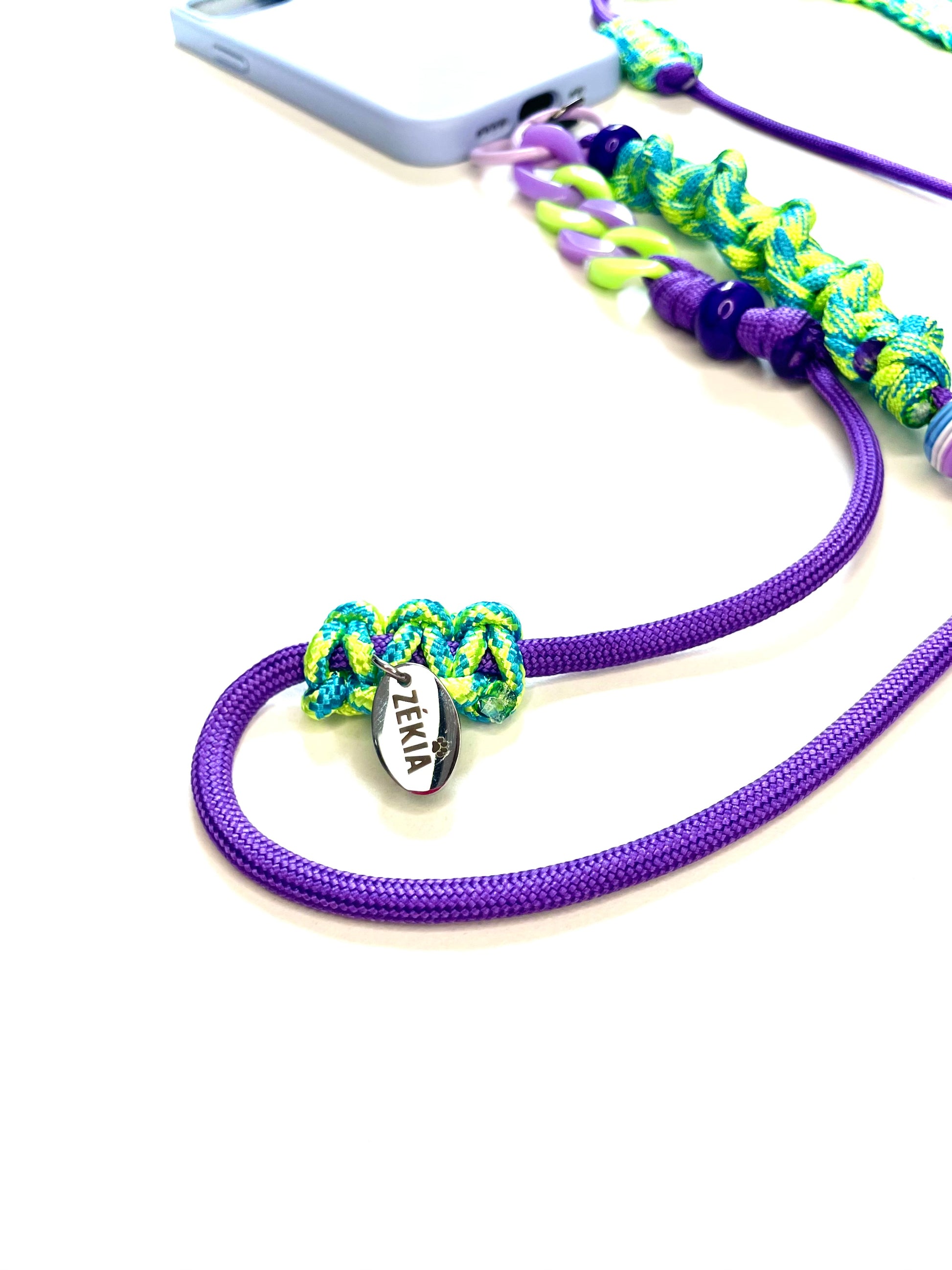 L'éclat acidulé d'un vert lime qui fusionne avec la profondeur d'un violet galactique et des éclats de bleu électrique. Un cordon de téléphone en ajustable, unique et artisanale, pensé pour un style futuriste et magnétique.