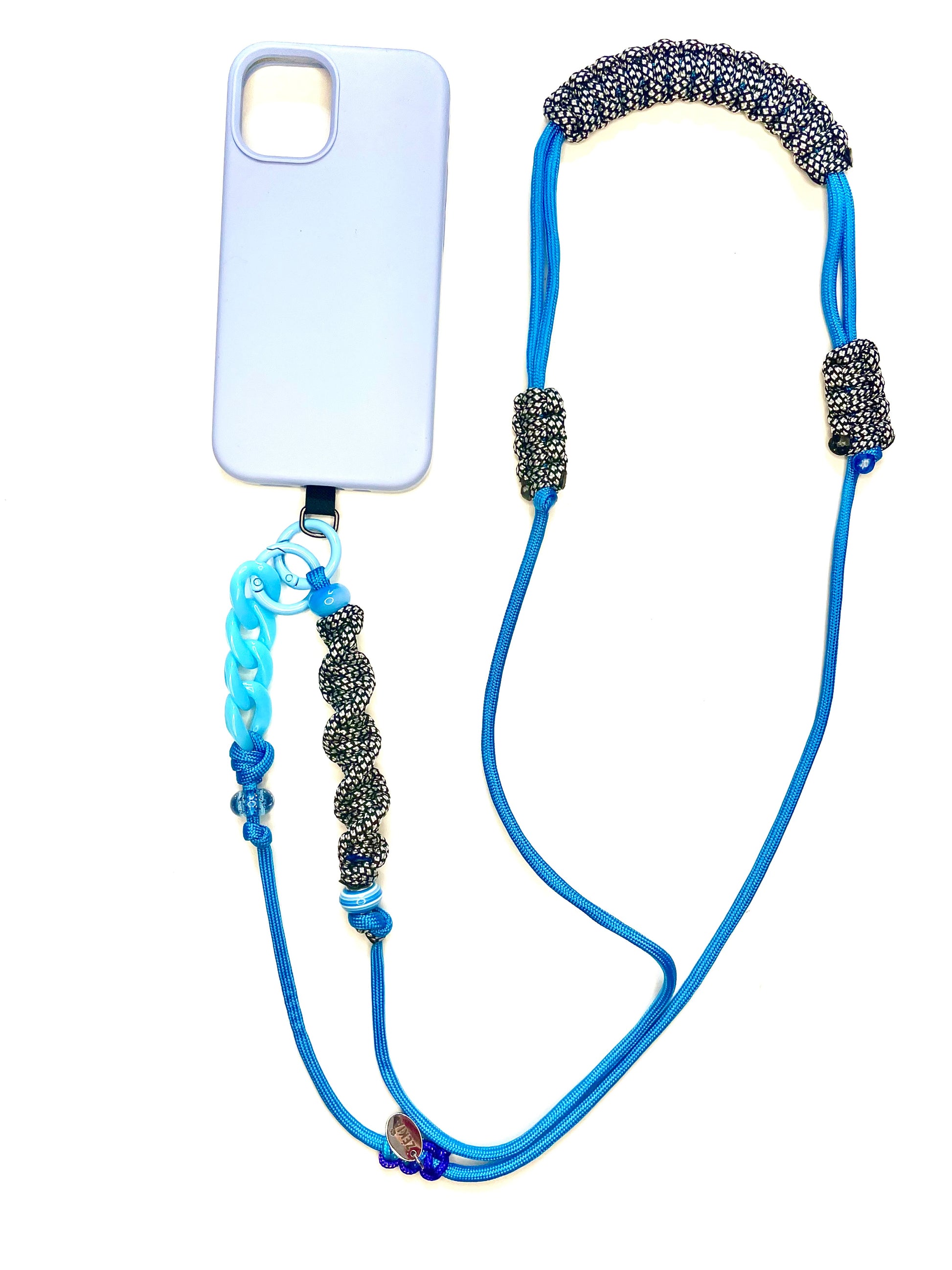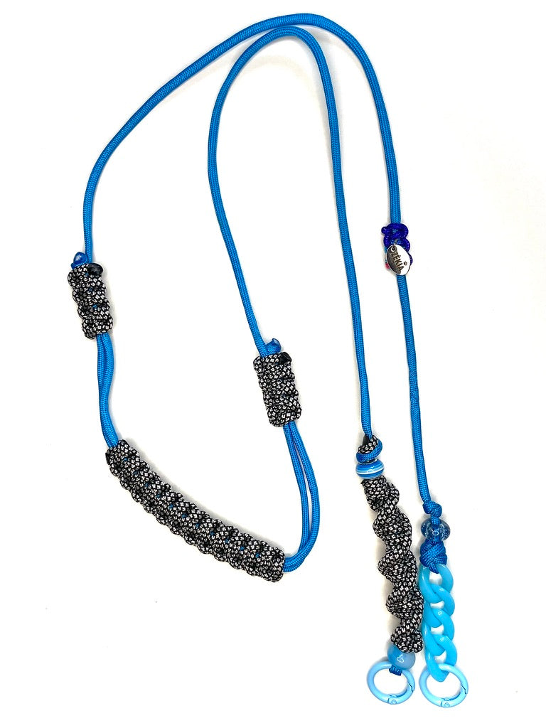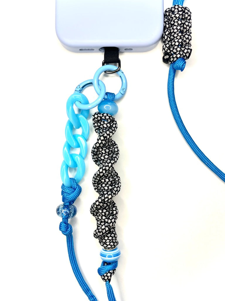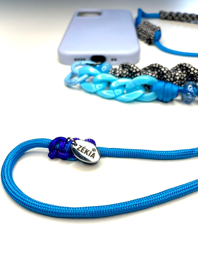 Un bleu profond illuminé par la pureté d'un blanc éclatant et la force d'un noir intense. Un cordon de téléphone ajustable, unique et artisanale, pensé pour un style puissant, intemporel et plein d'assurance.