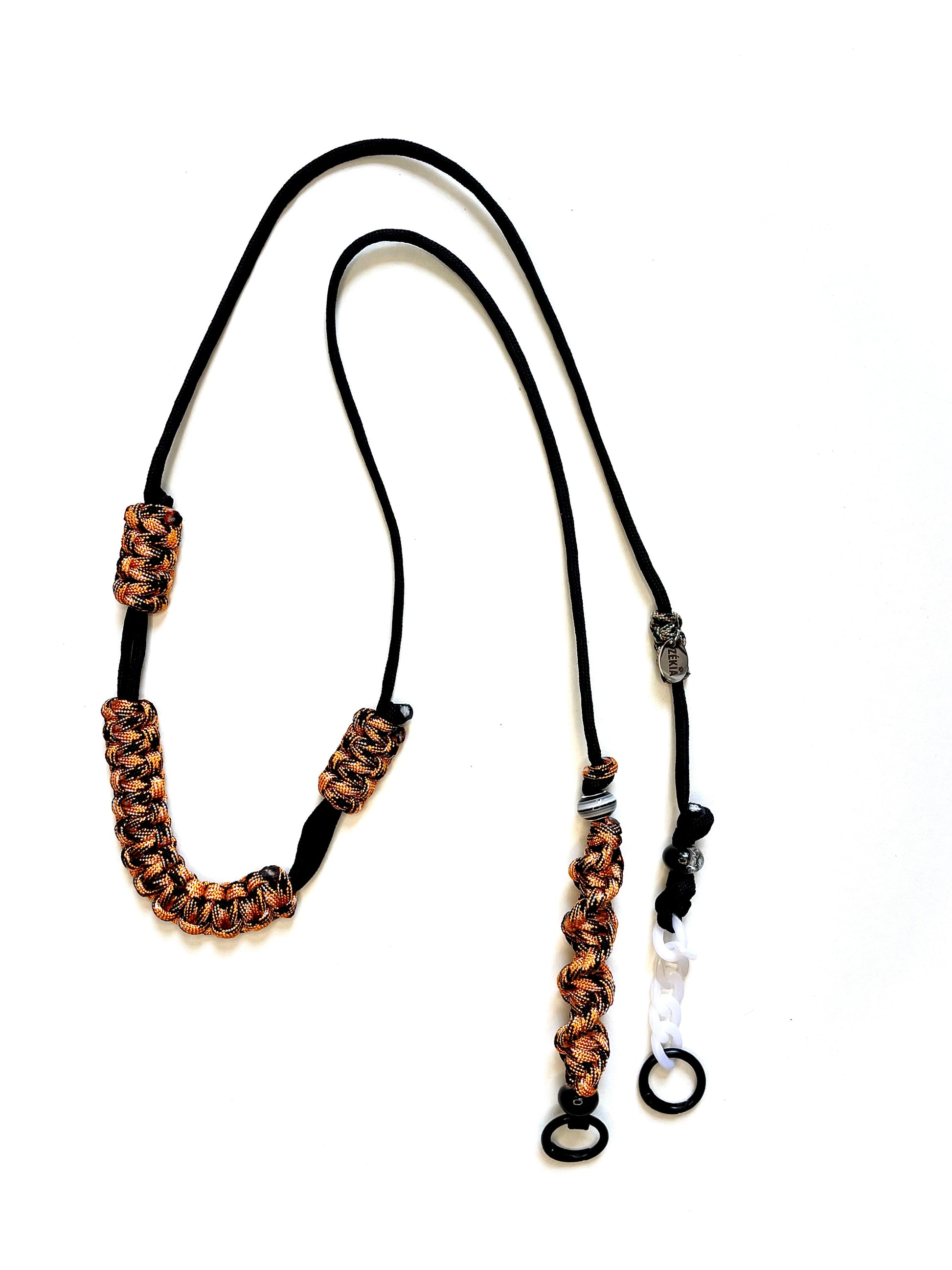 La puissance d'un noir profond qui se mêle à l'intensité d'un orange flamboyant, relevé de nuances tigrées. Un cordon de téléphone ajustable, tressé à la main, pour un style énergique et indomptable.