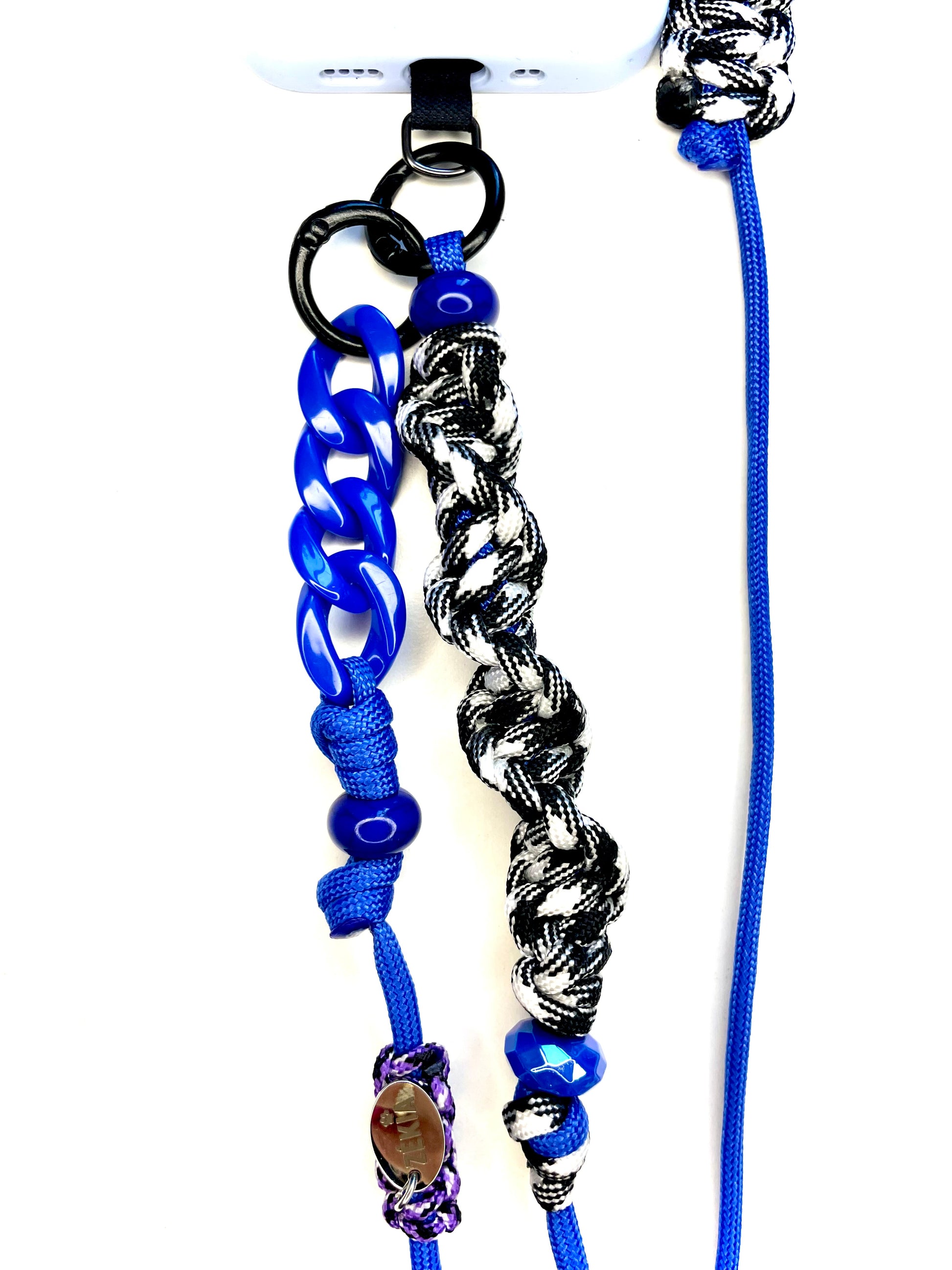 La force d'un bleu océan, contrasté par l'éclat d'un blanc d'écume et la profondeur d'un noir intense. Un cordon de téléphone en paracorde, unique et artisanale, pensé pour un style puissant et affirmé.
