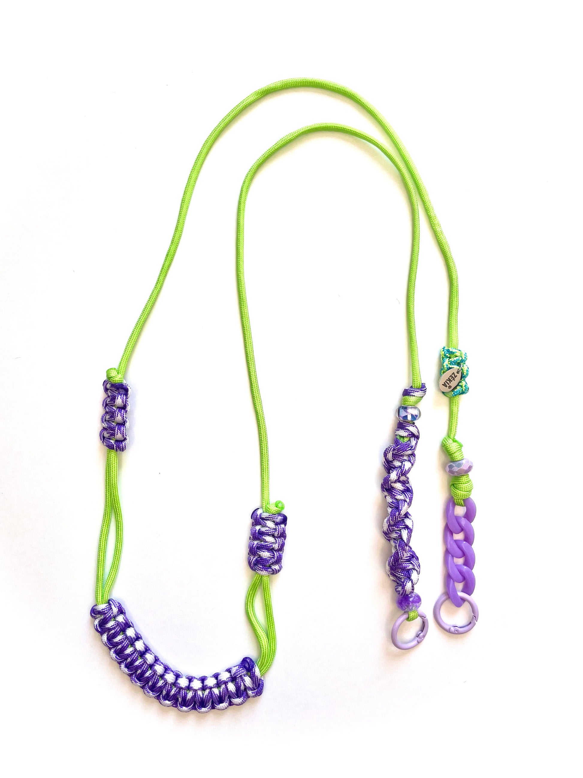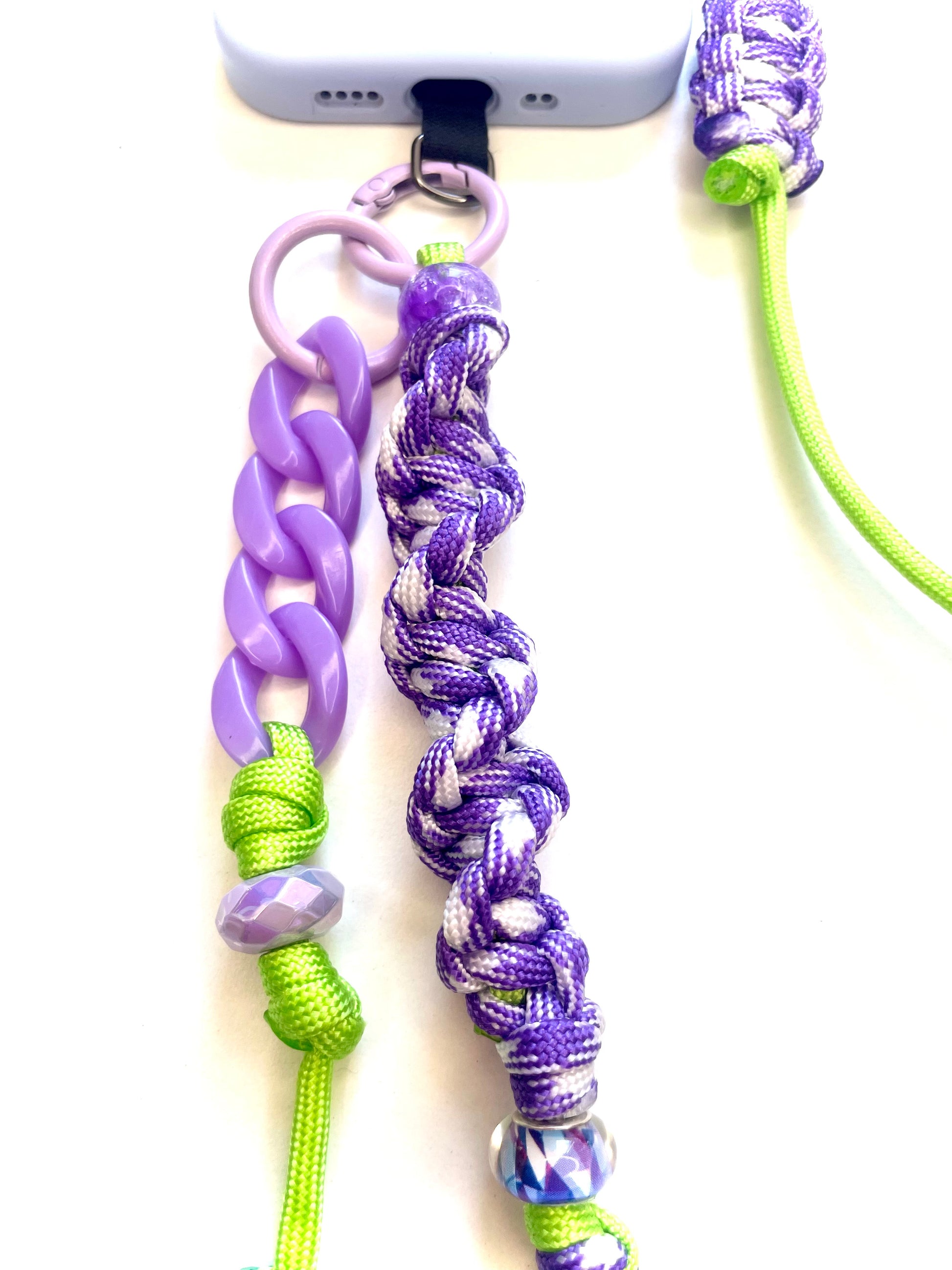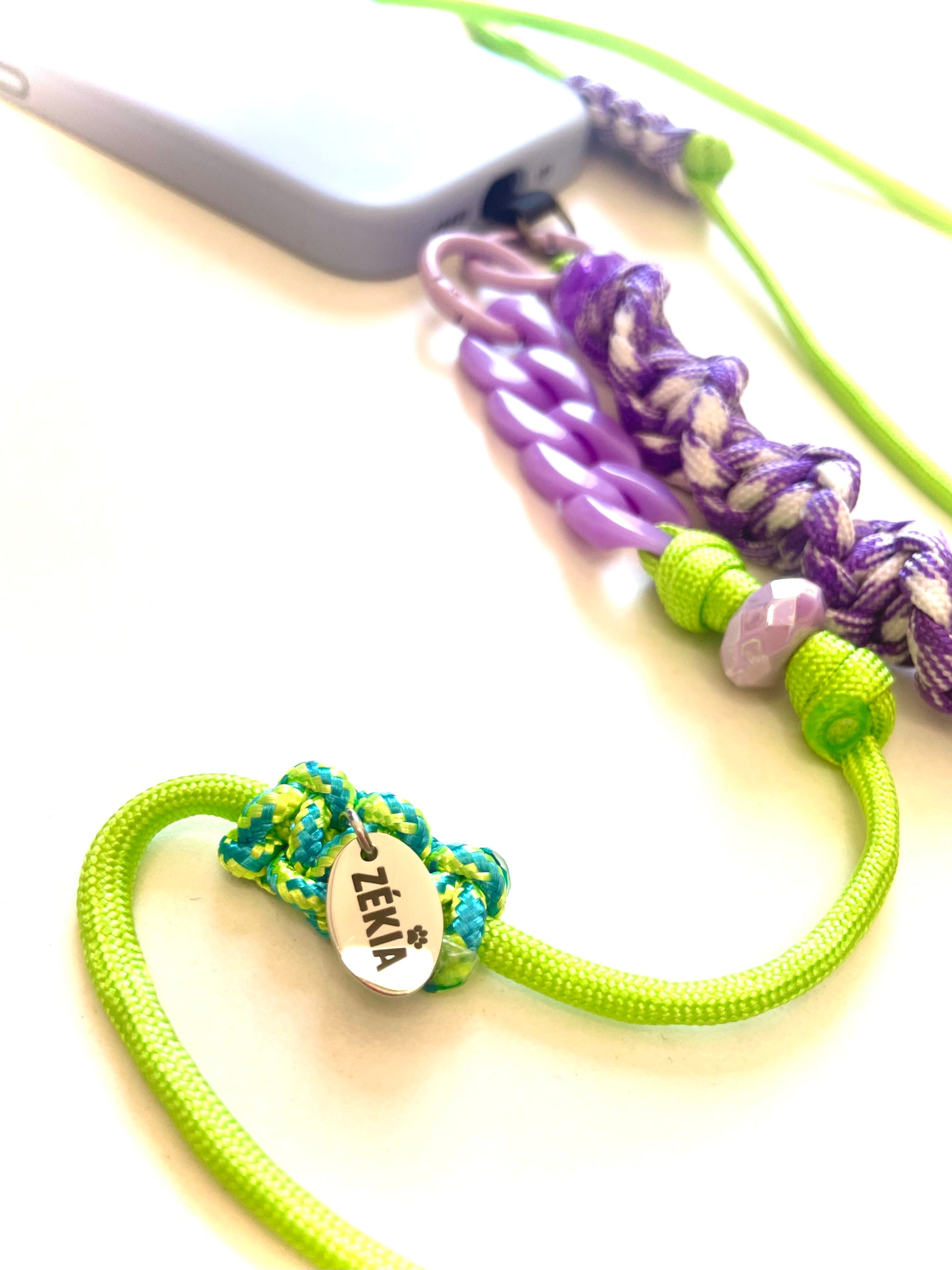 Un vert liane lumineux qui s'entrelace à un violet profond, relevé de touches claires. Un cordon de téléphone en paracorde, unique et artisanale, pensé pour un style vibrant et plein de fraîcheur.