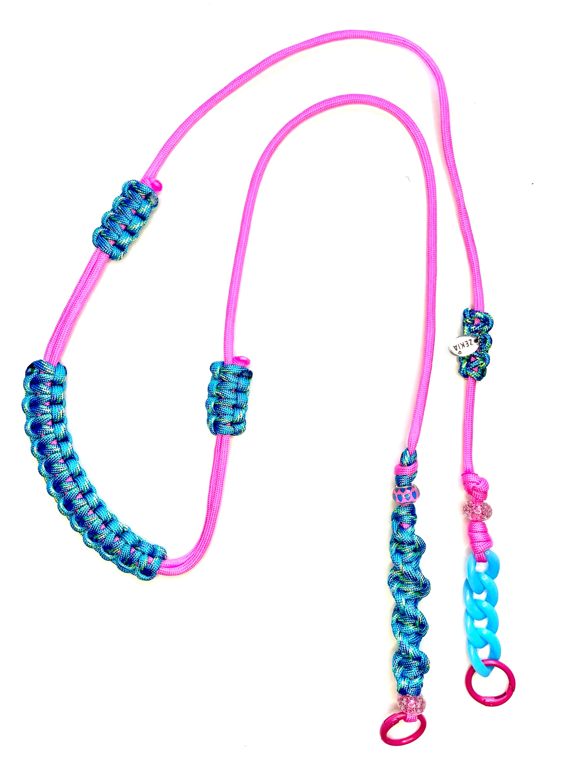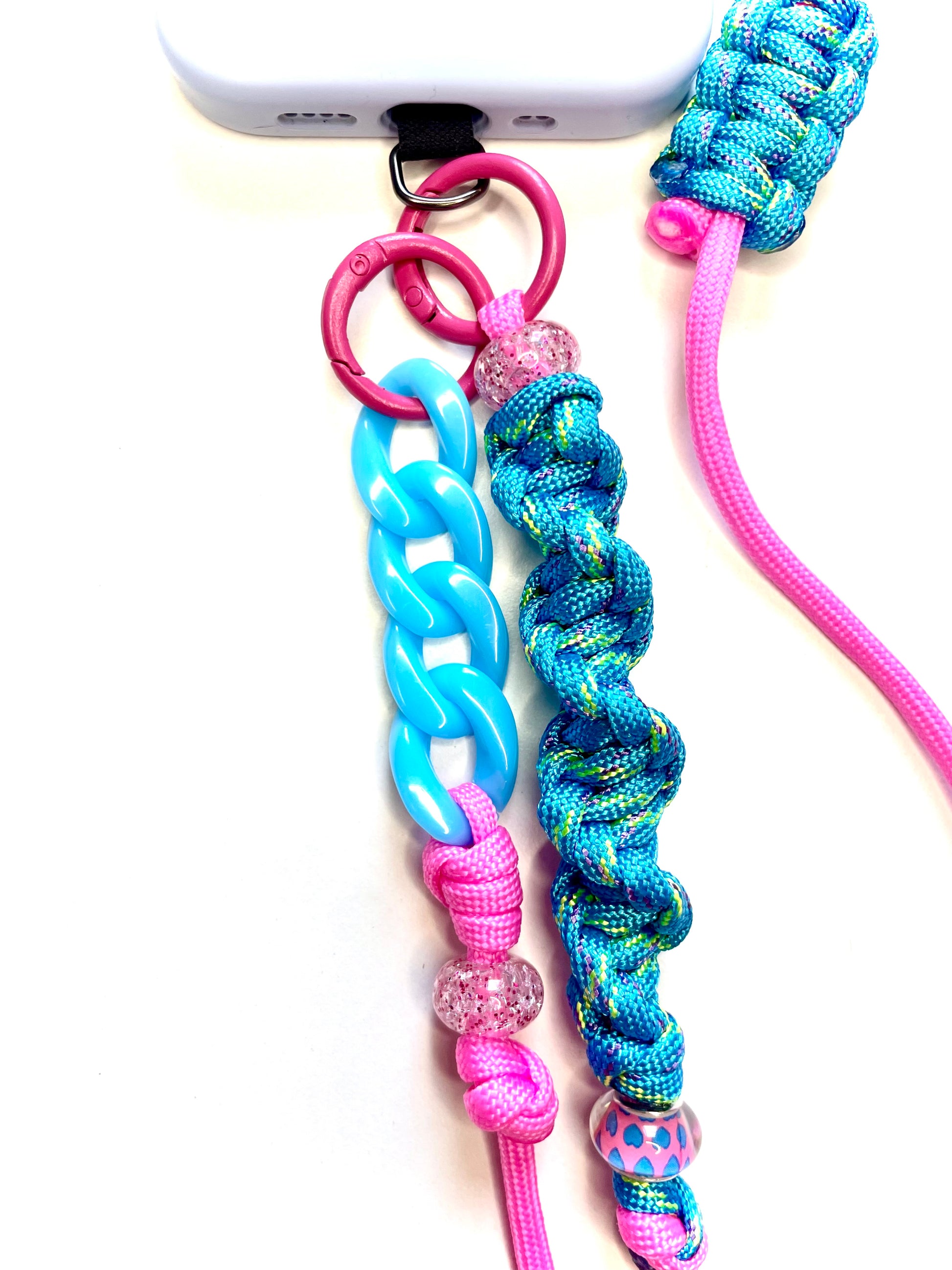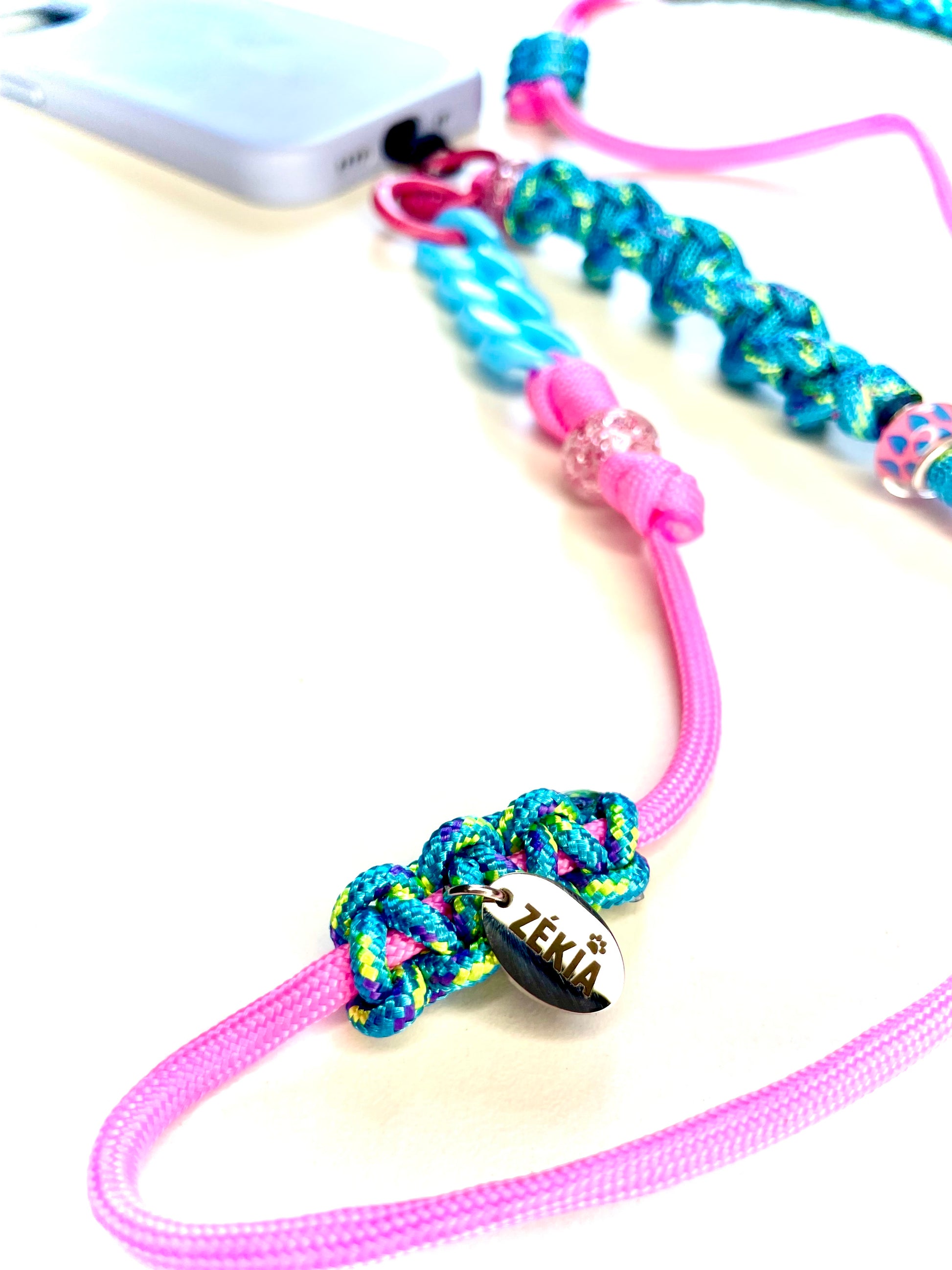 L'éclat sucré d'un rose vif twisté de nuances pétillantes de turquoise qui rappellent des bulles pop. Un cordon de téléphone en paracorde, unique et artisanale, pensé pour un style joyeux et plein de fantaisie.