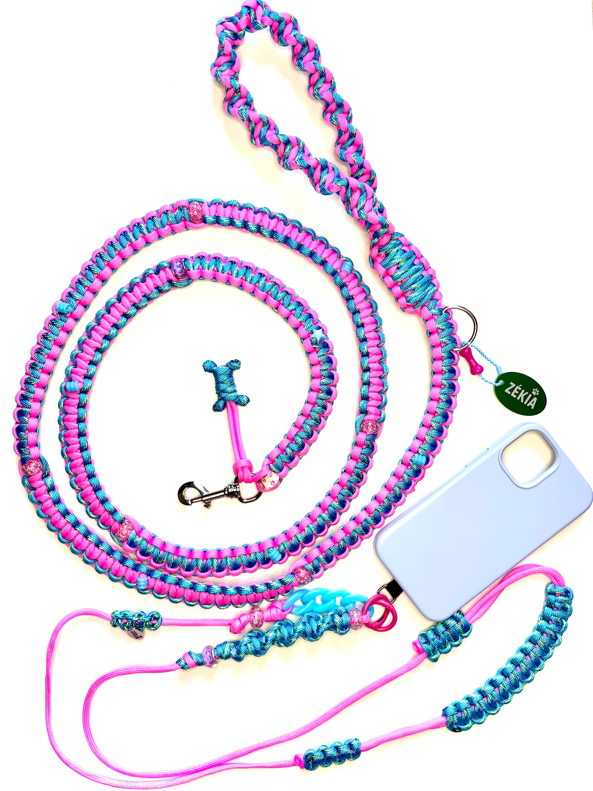 Pensés comme de véritables pièces de duo, les cordons de téléphone ZÉKIA s'accordent avec les laisses et charms assortis. Un concept matchy-matchy unique : un lien tissé qui affiche, avec style, la complicité entre vous et votre chien.