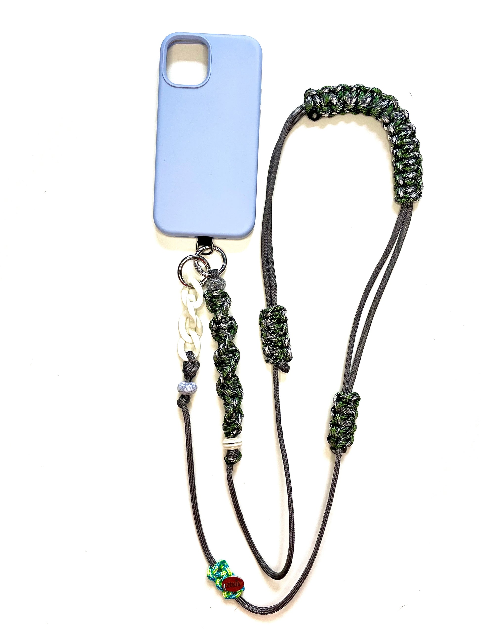 L'alliance d'un gris anthracite et d'un vert mousse, relevée de nuances sombres. Un cordon de téléphone ajustable, unique et artisanale, pensé pour un style racé et plein de prestance.