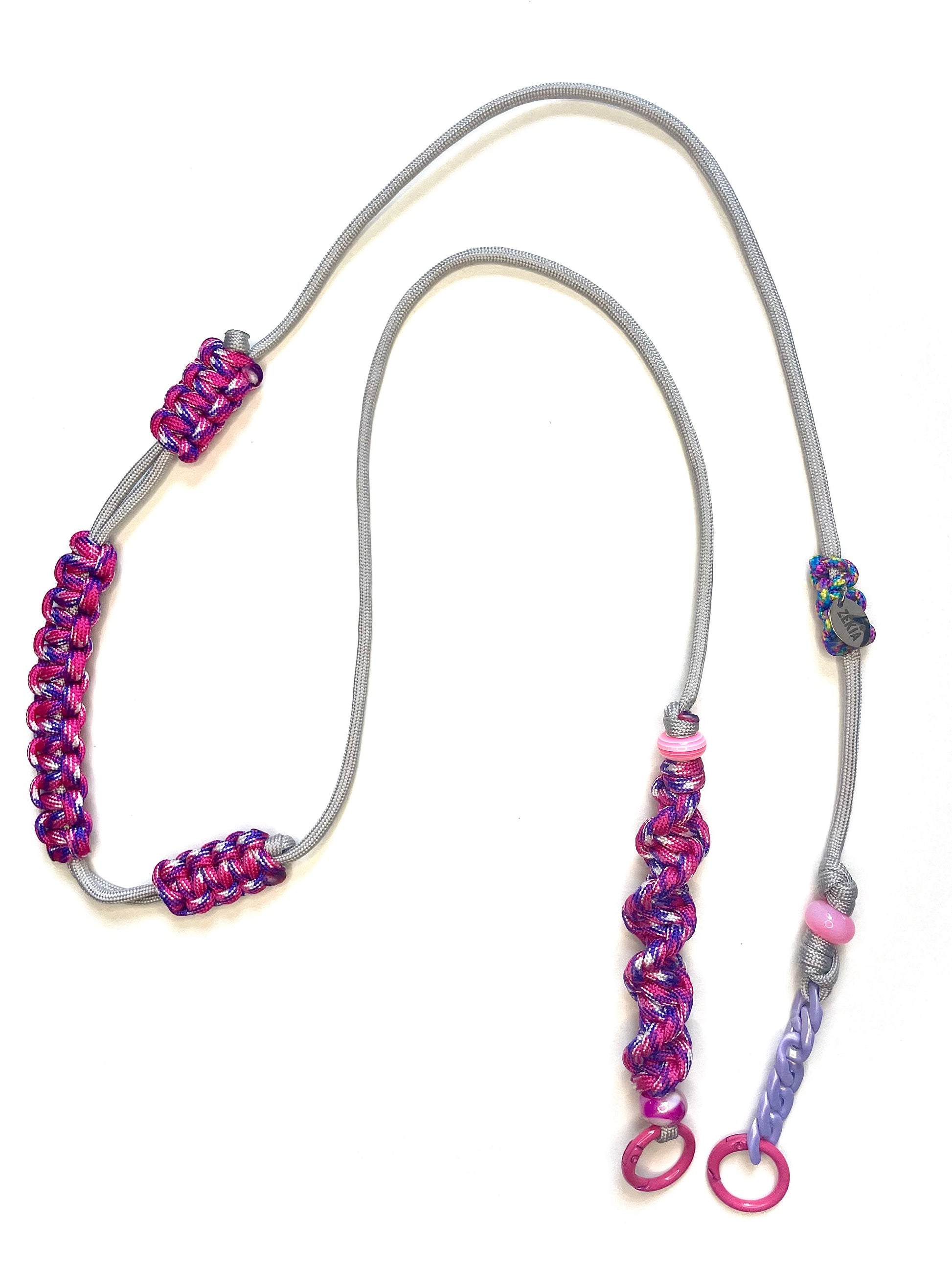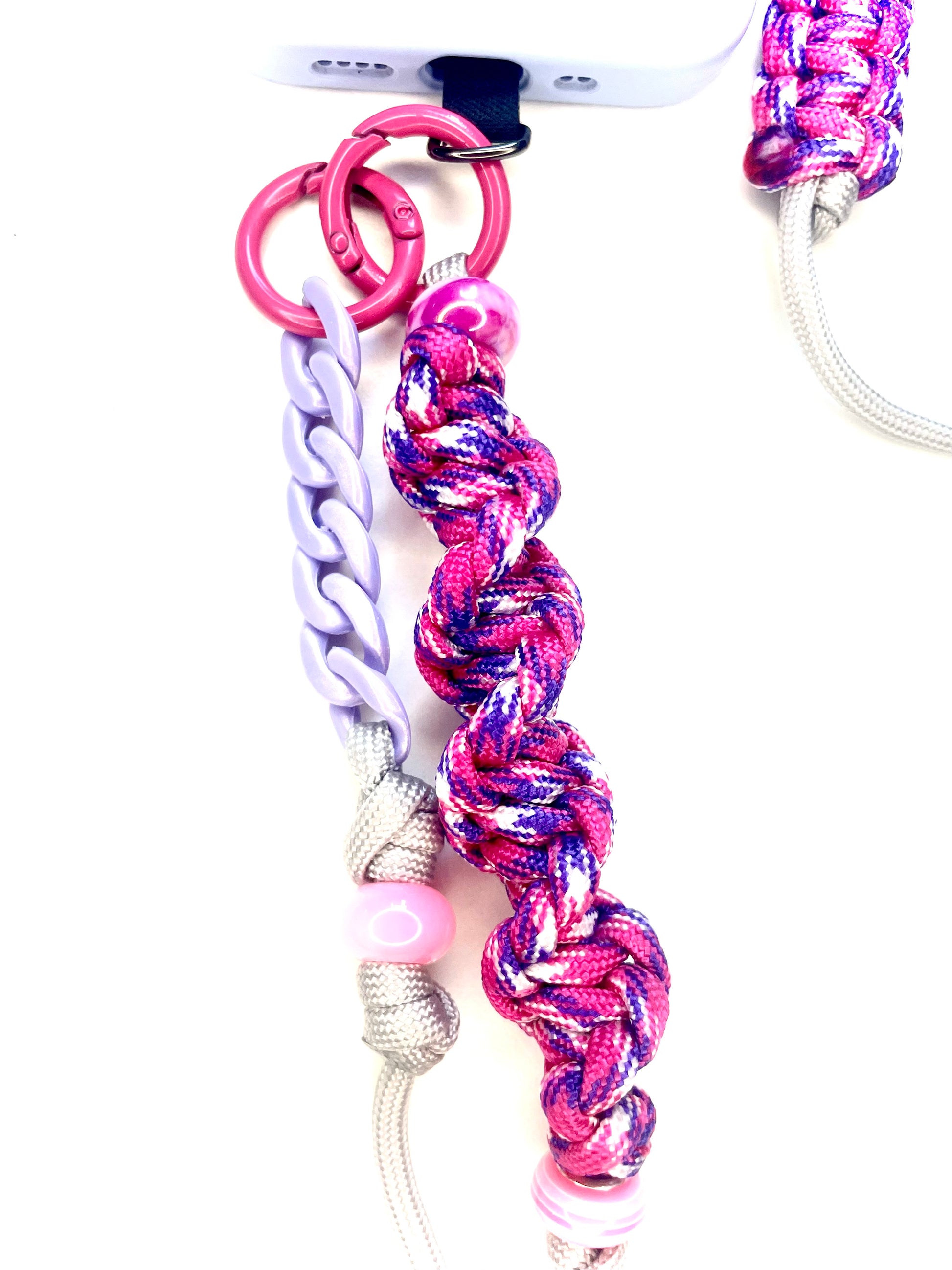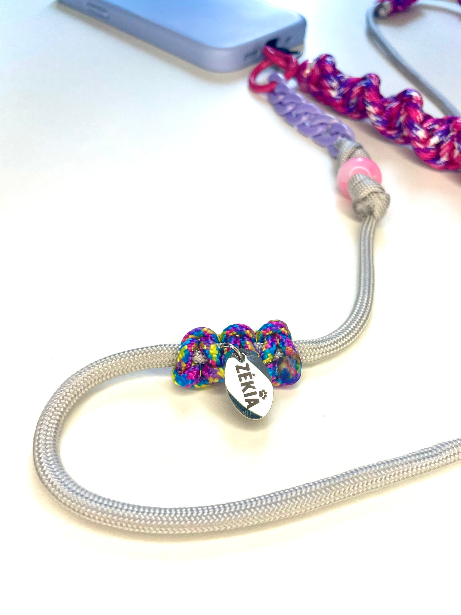 Un rose fuchsia vibrant, adouci par un violet profond et équilibré par une touche de gris. Un cordon de téléphone ajustable, tressé à la main, pour un style joyeux, élégant et lumineux.