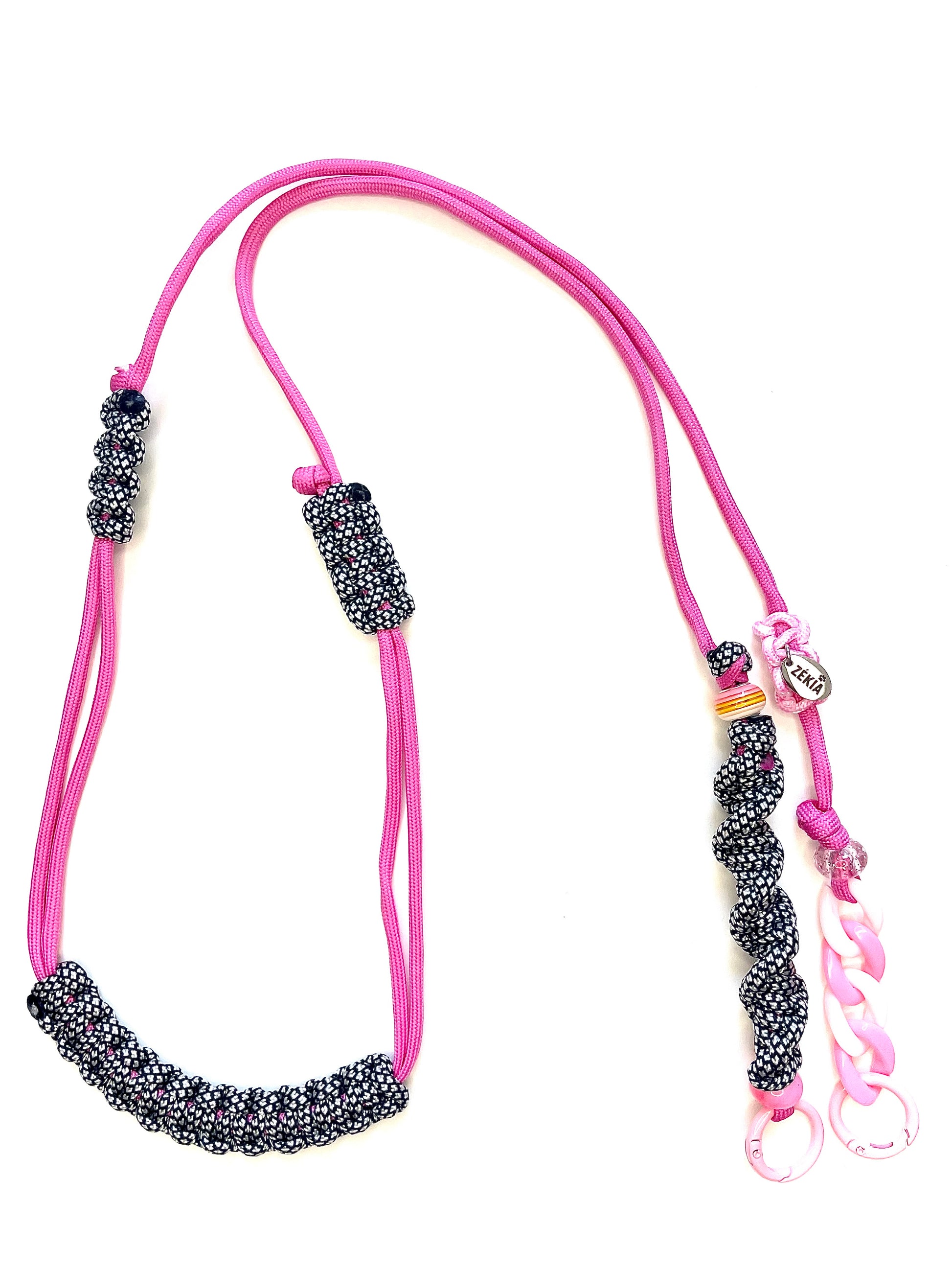 L'audace d'un rose éclatant qui s'embrase au contact d'un noir profond, relevée par la brillance subtile d'un blanc pur. Un cordon de téléphone ajustable, tressé à la main, pour un style glamour et rebelle.