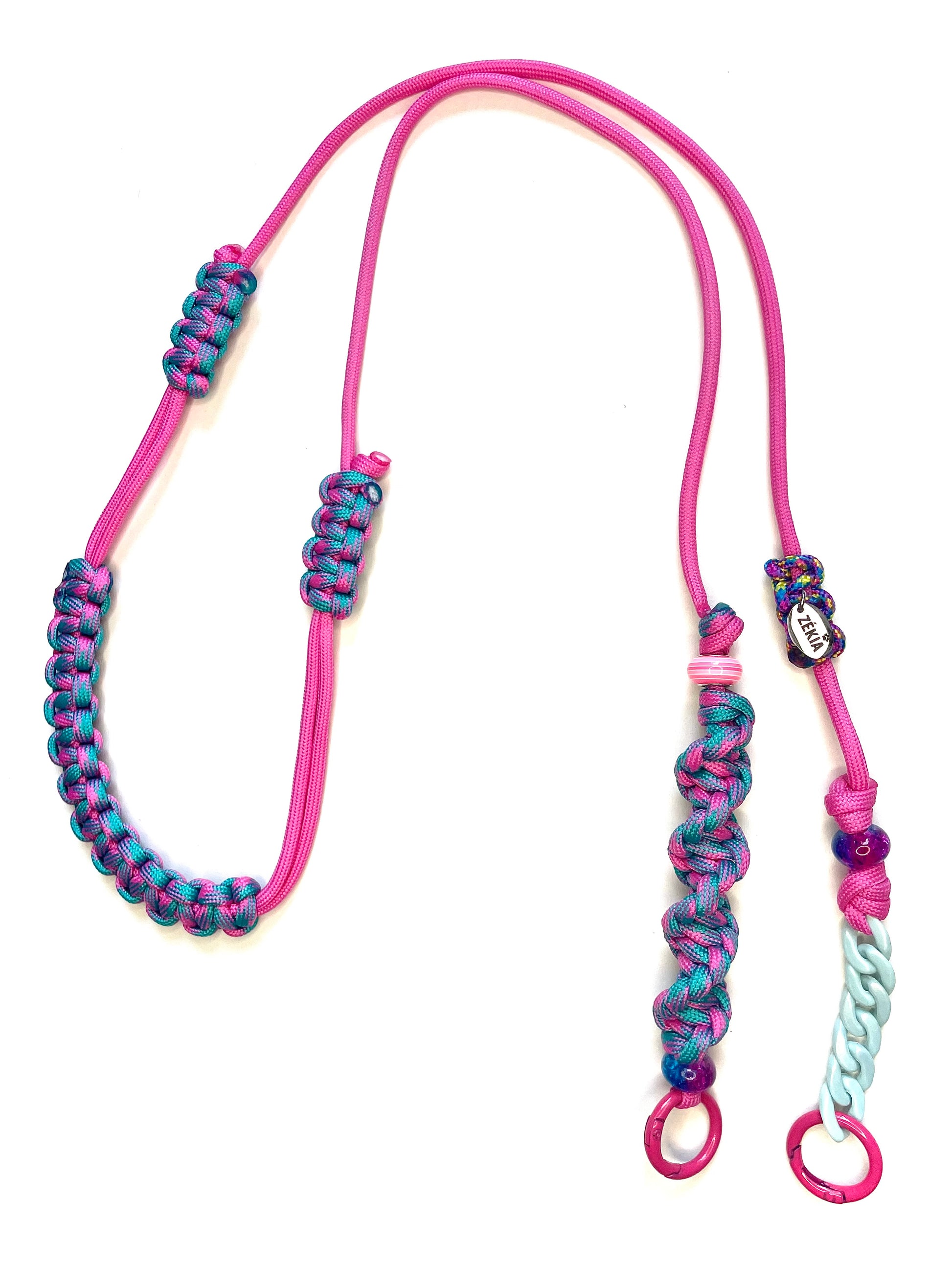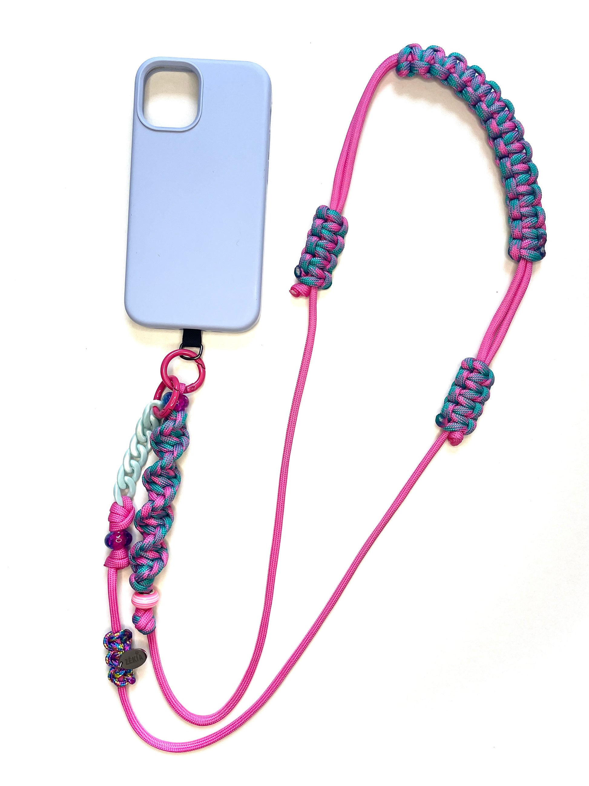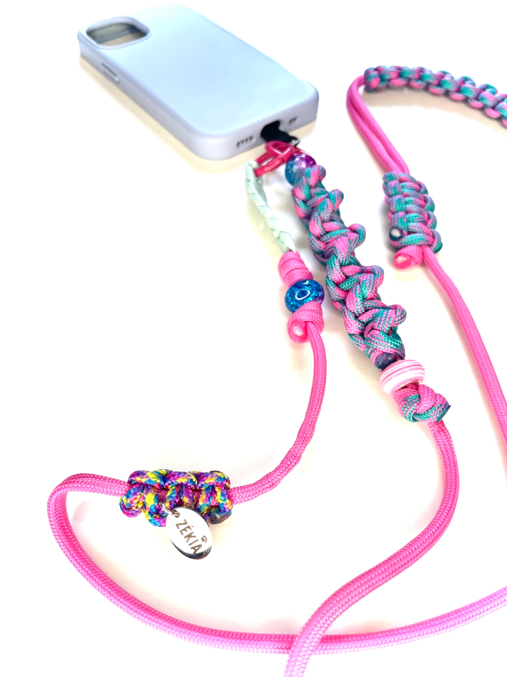 La douceur d'un rose bonbon qui pétille, réveillée par l'éclat d'un bleu turquoise vif qui rafraîchit l'ensemble. Un cordon de téléphone ajustable, tressé à la main, pour un style fun, frais et plein de bonne humeur.
