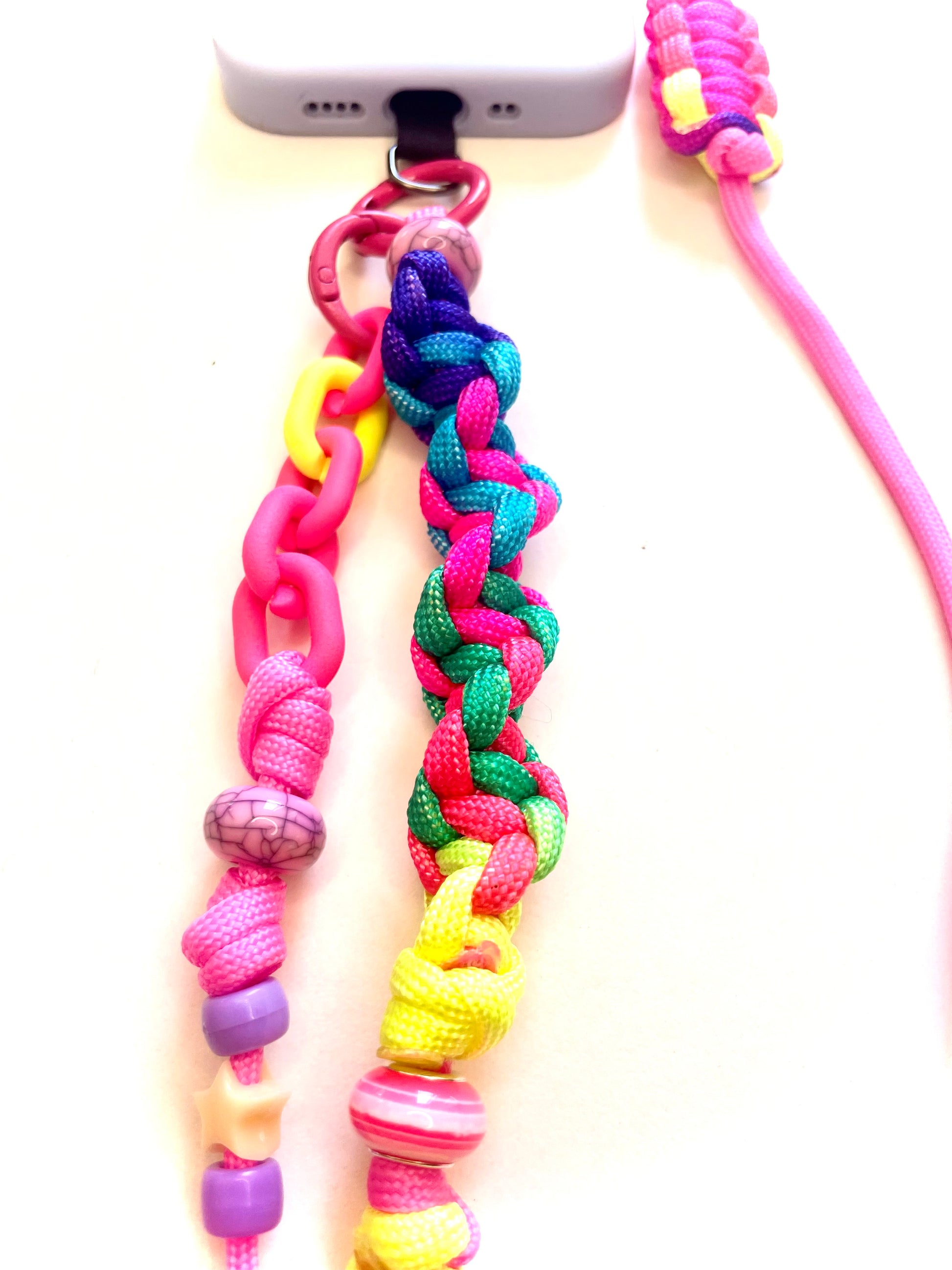 La gourmandise d'un rose éclatant, qui se marie à une explosion multicolore façon bar à bonbons. Un cordon de téléphone ajustable, unique et artisanale, pensé pour un style pétillant et plein de fantaisie.