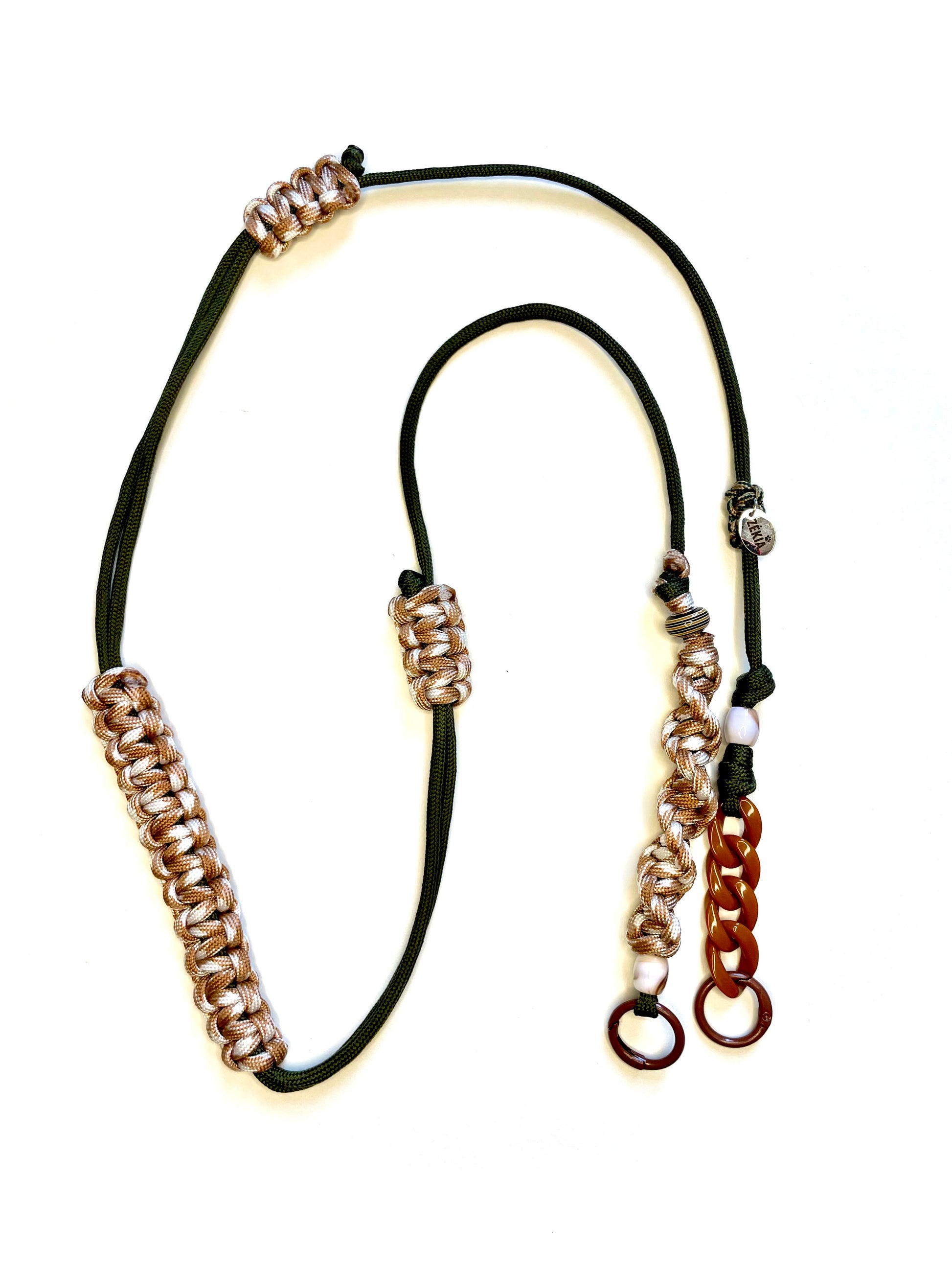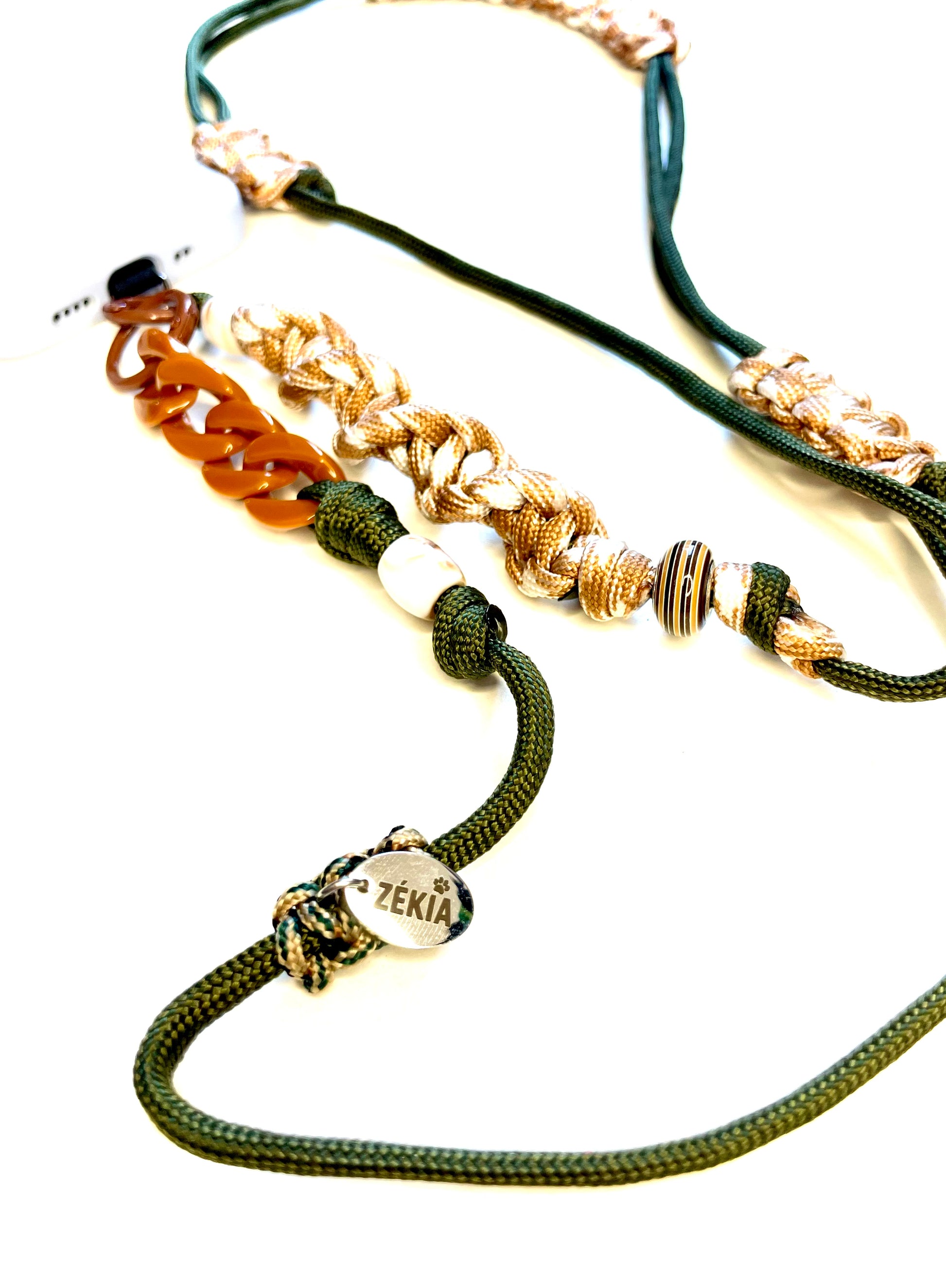 La chaleur d'un kaki profond, relevée de bruns terreux et éclairée par des touches de blanc sable. Un cordon de téléphone ajustable, unique et artisanale, pensé pour un style nomade et aventurier.