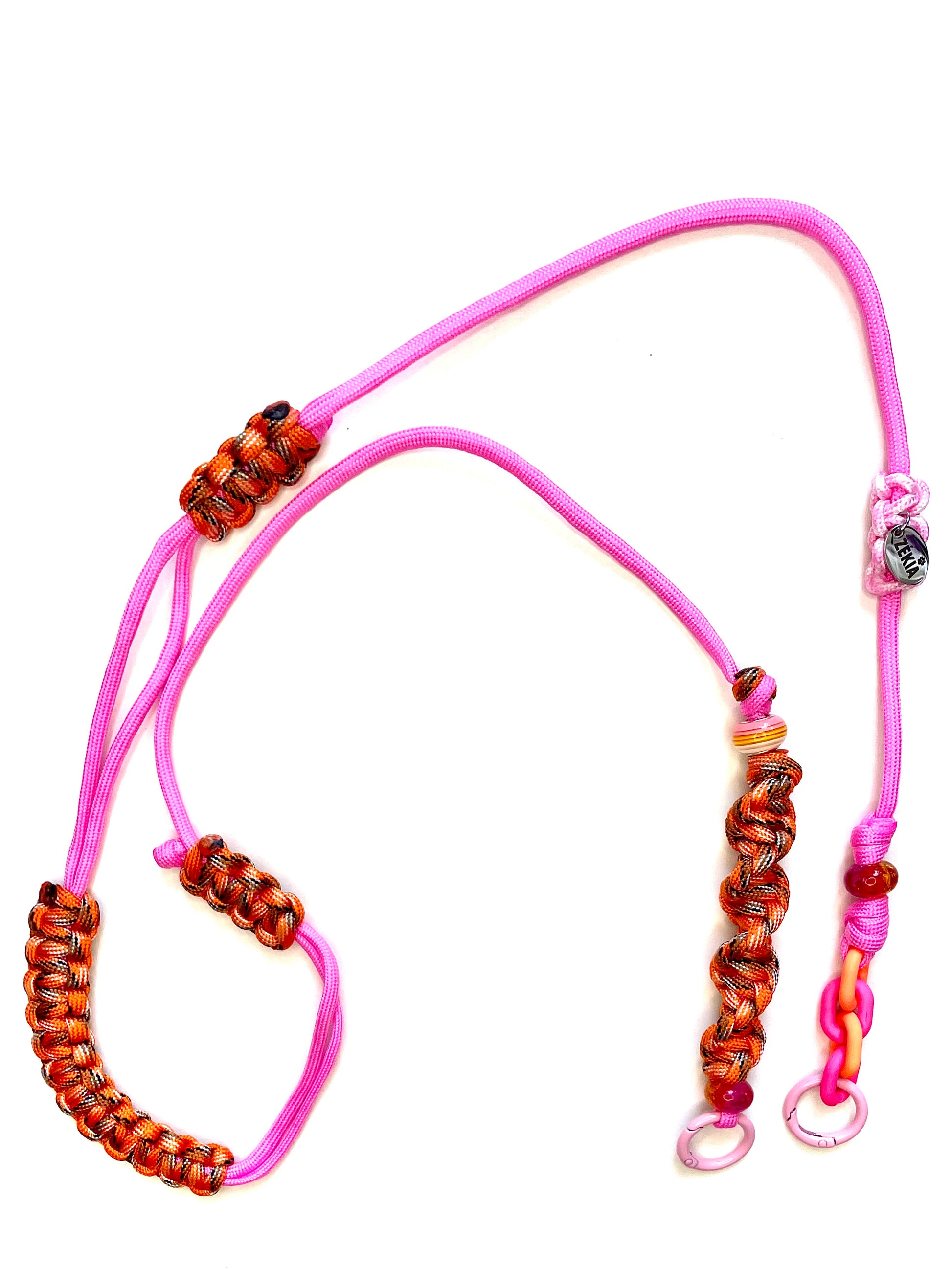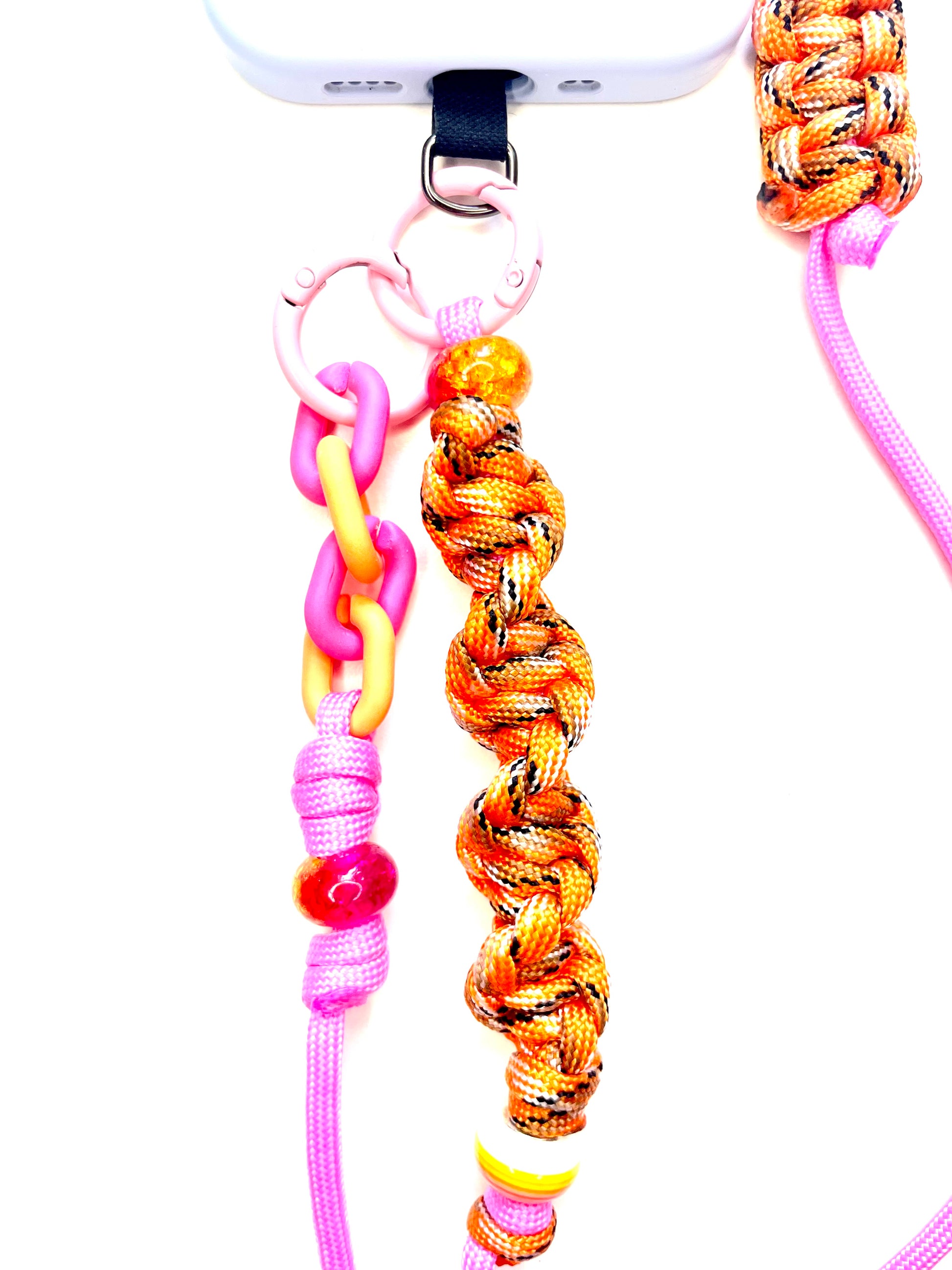 L'intensité vibrante d'un rose éclatant en fusion avec l'énergie solaire de nuances orangées. Un cordon de téléphone ajustable, tressé à la main, pour un style flamboyant et plein de vitalité.