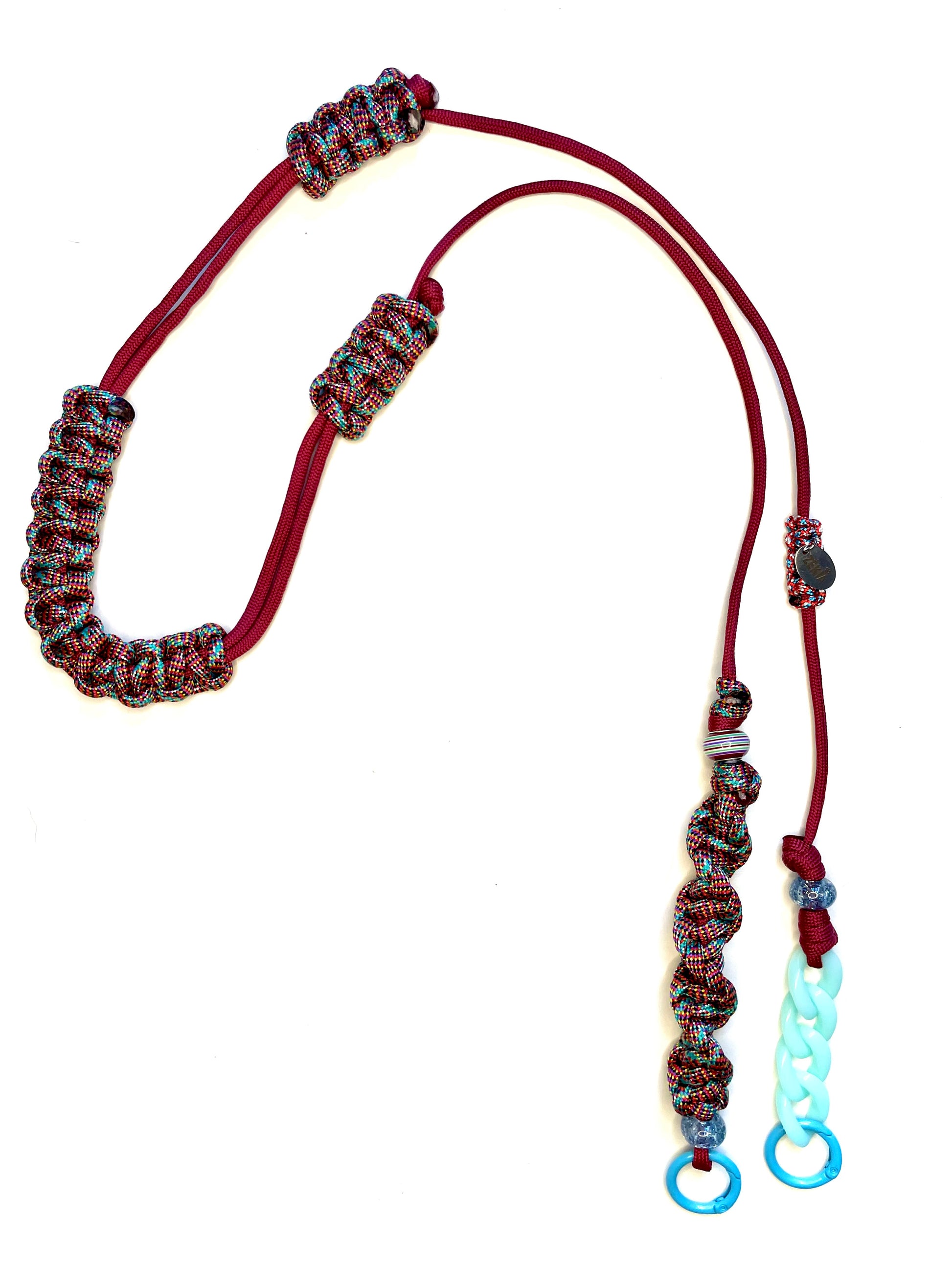 La profondeur chaleureuse d'un bordeaux intense, réveillée par l'éclat vibrant d'un bleu subtil. Un cordon de téléphone ajustable, tressé à la main, pour un style élégant et audacieux.