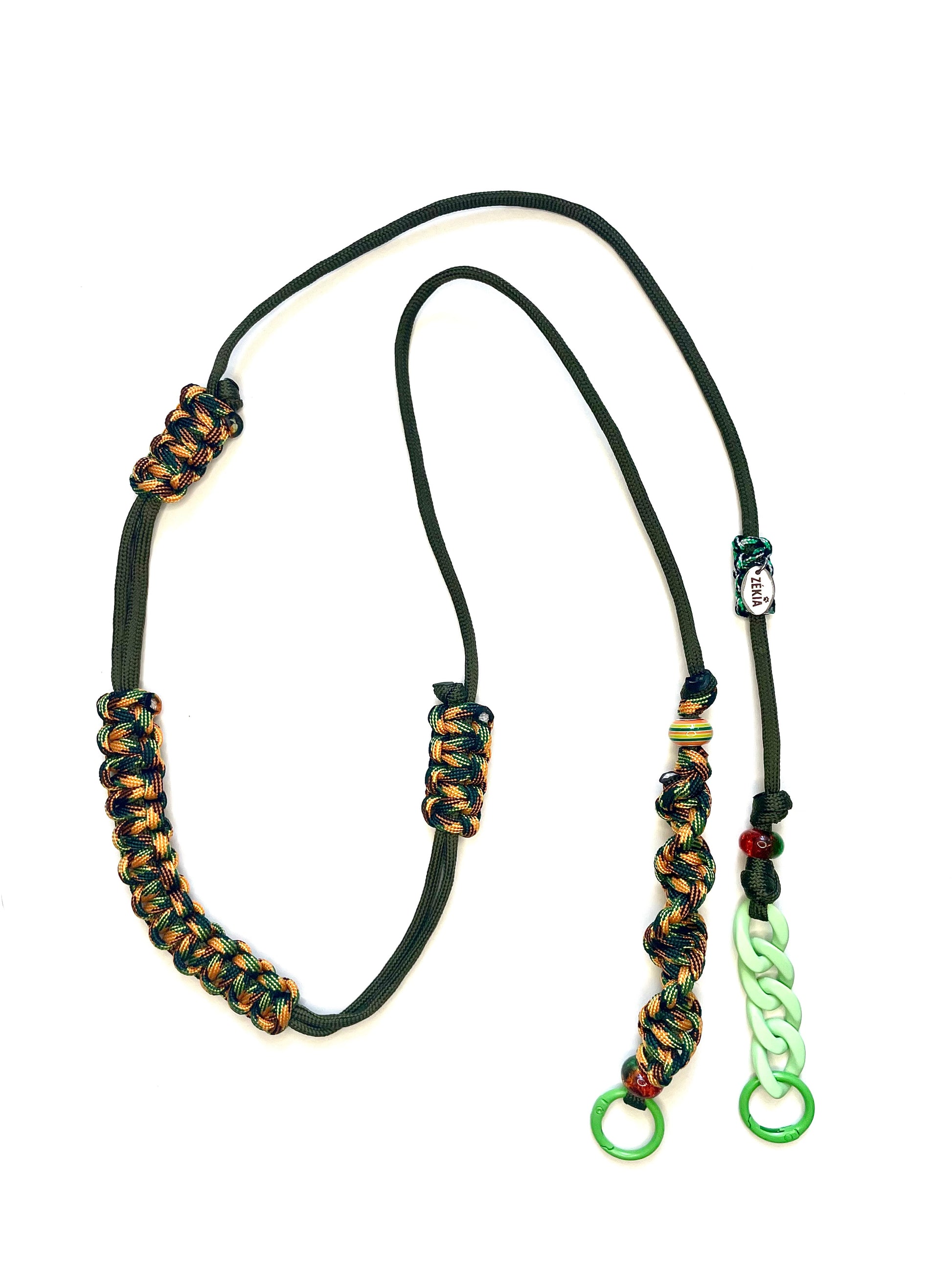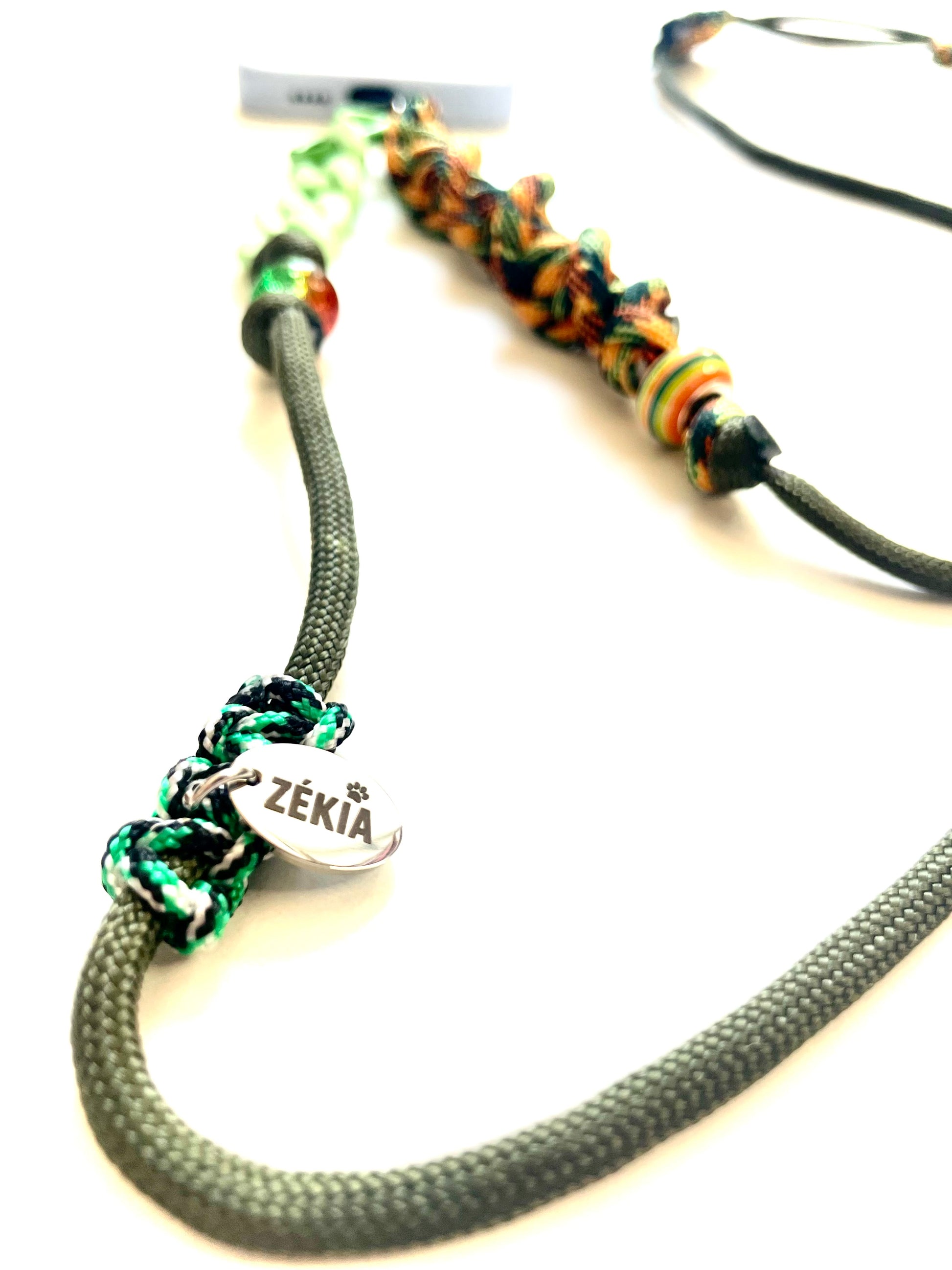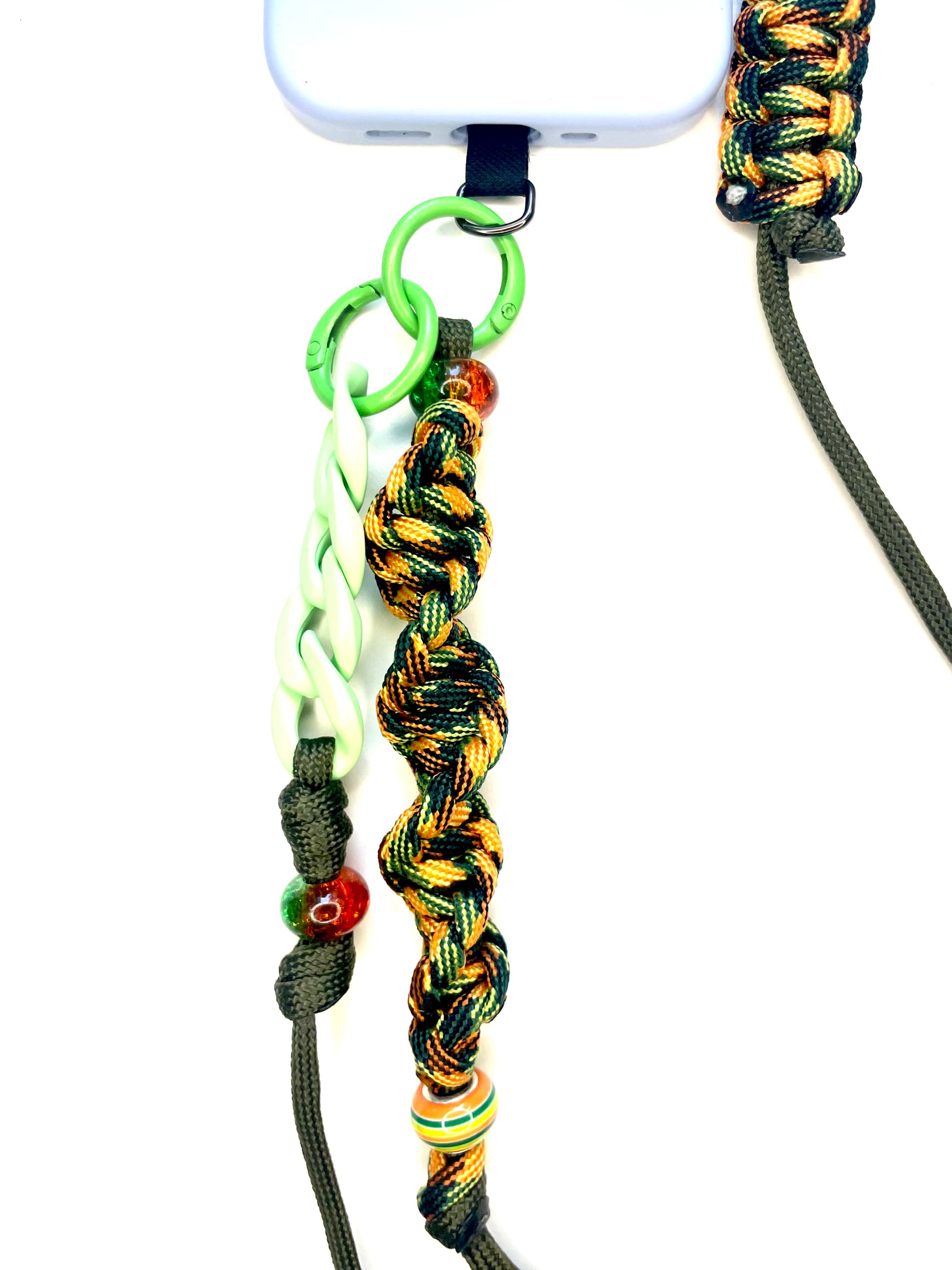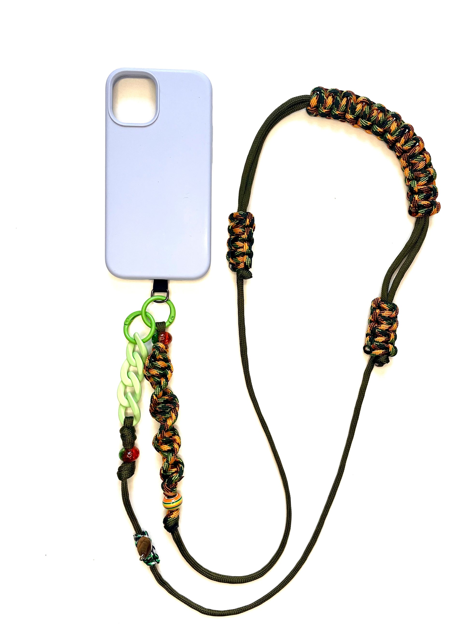 Un vert kaki intense, réchauffé par des éclats d'orange ardent et traversé de nuances sombres. Un cordon de téléphone en paracorde, unique et artisanale, pensé pour un style aventurier et authentique.