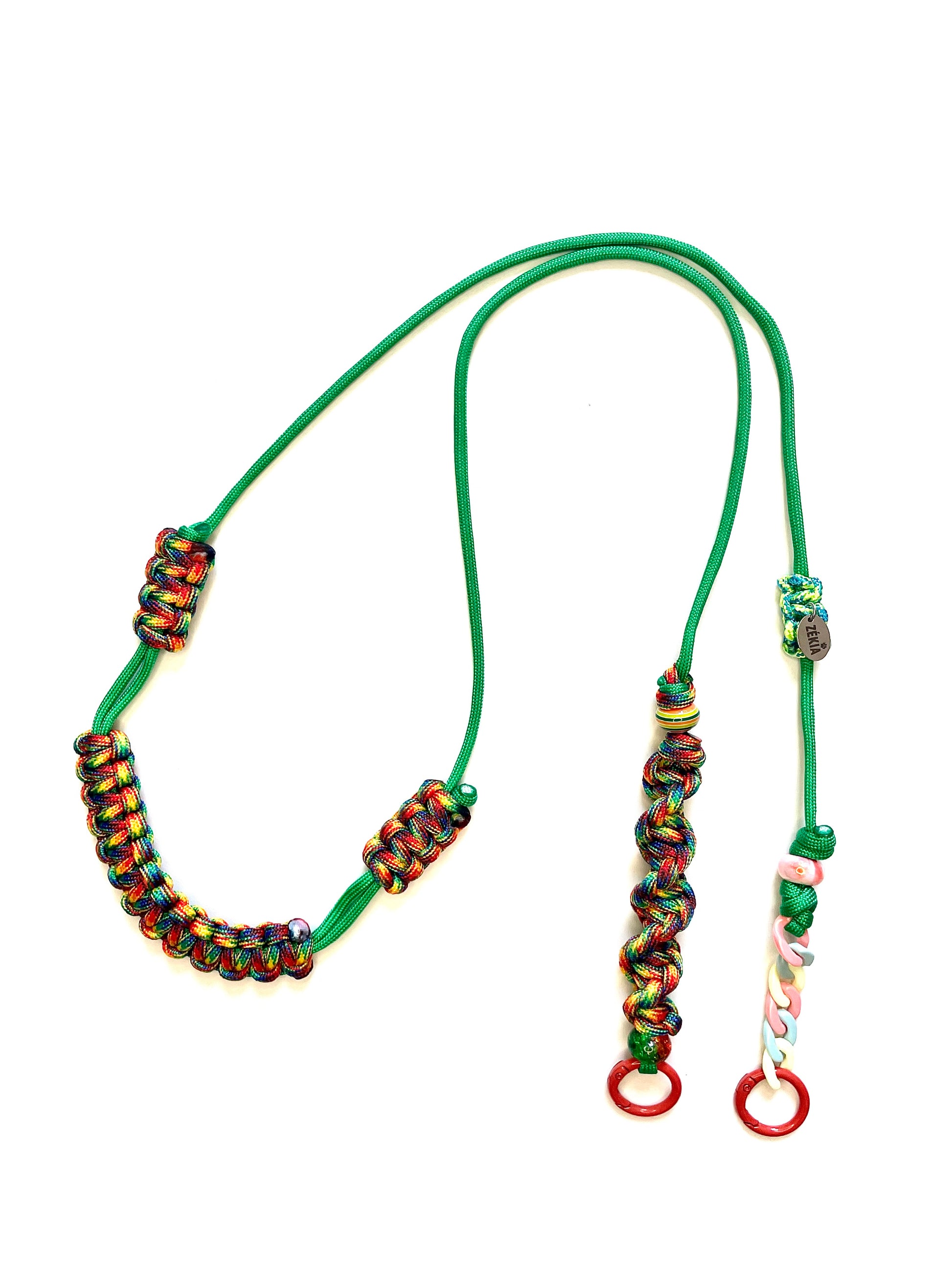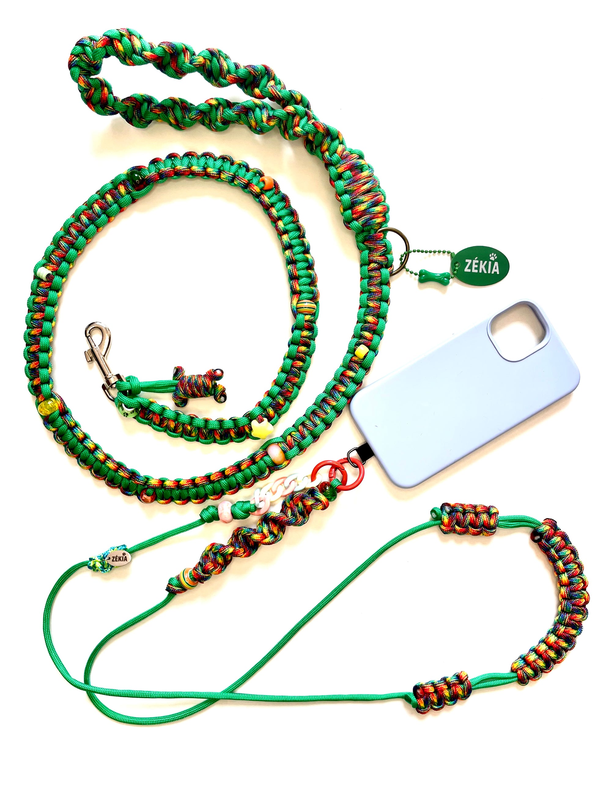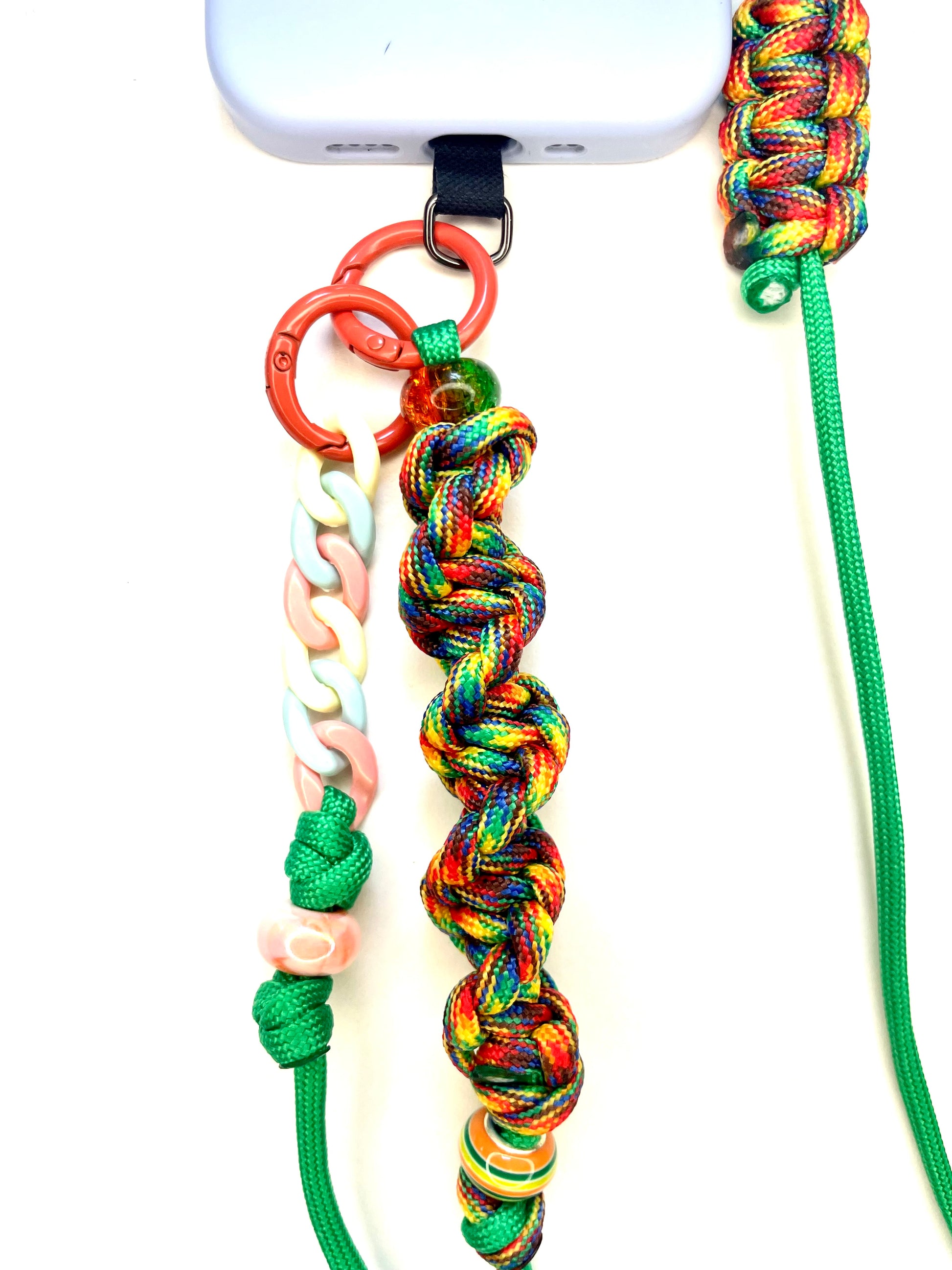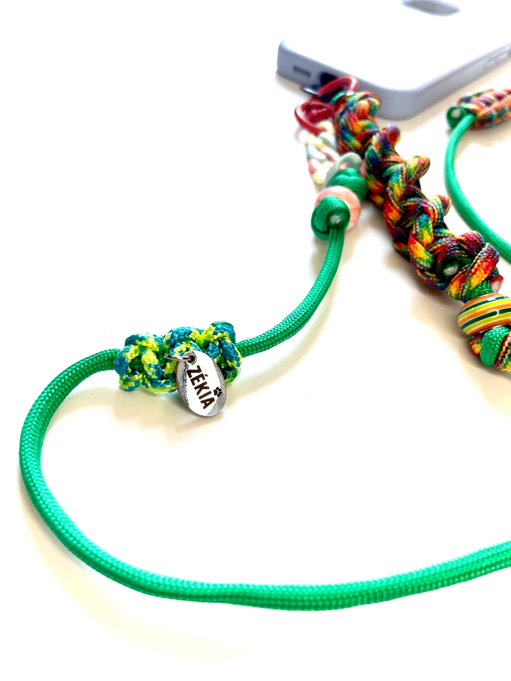 L'explosion tropicale d'un vert éclatant, mêlé à l'énergie d'un jaune solaire et au feu d'un rouge flamboyant. Un cordon de téléphone ajustable, tressé à la main, pour un style exotique et plein d'audace.
