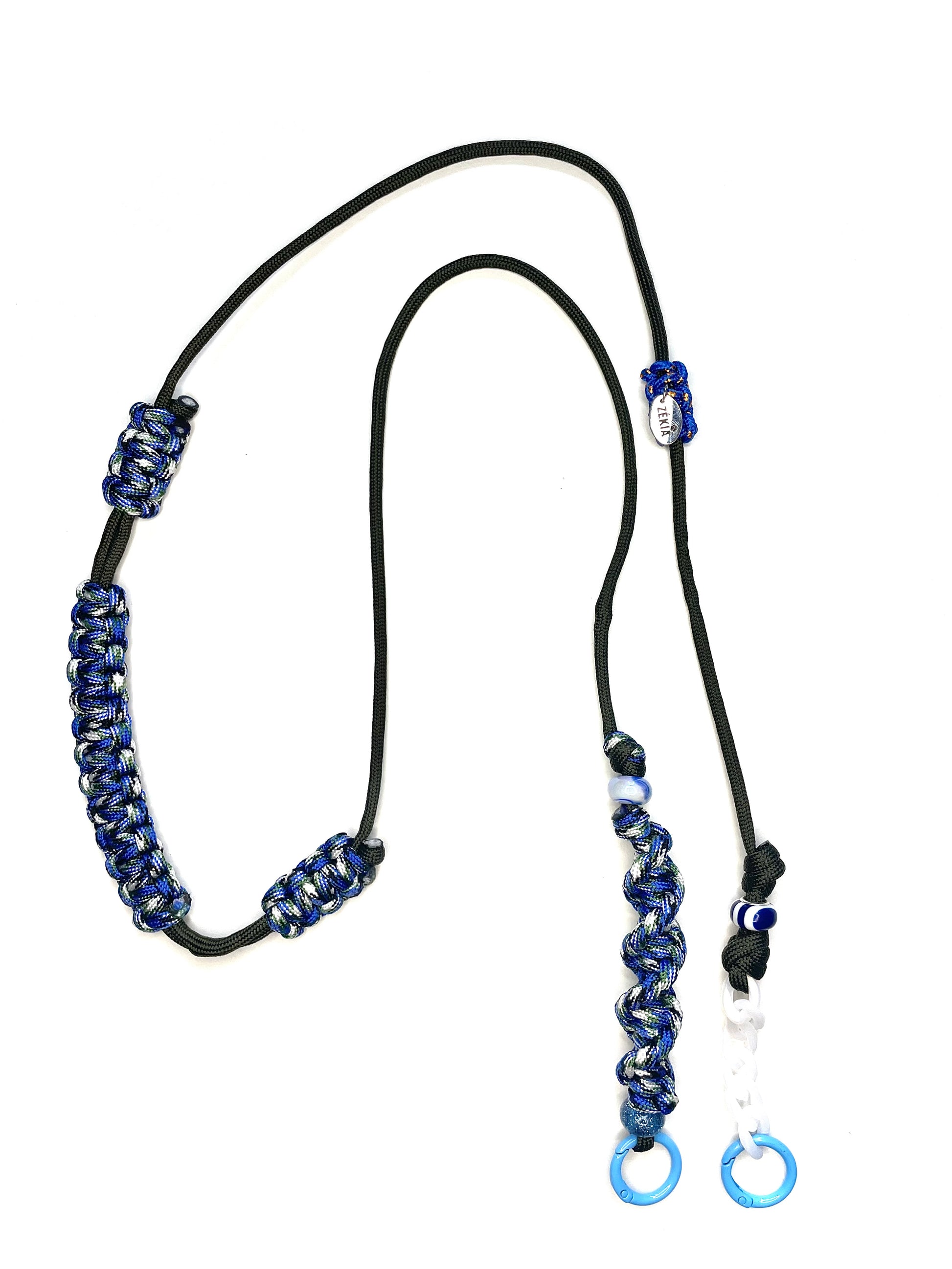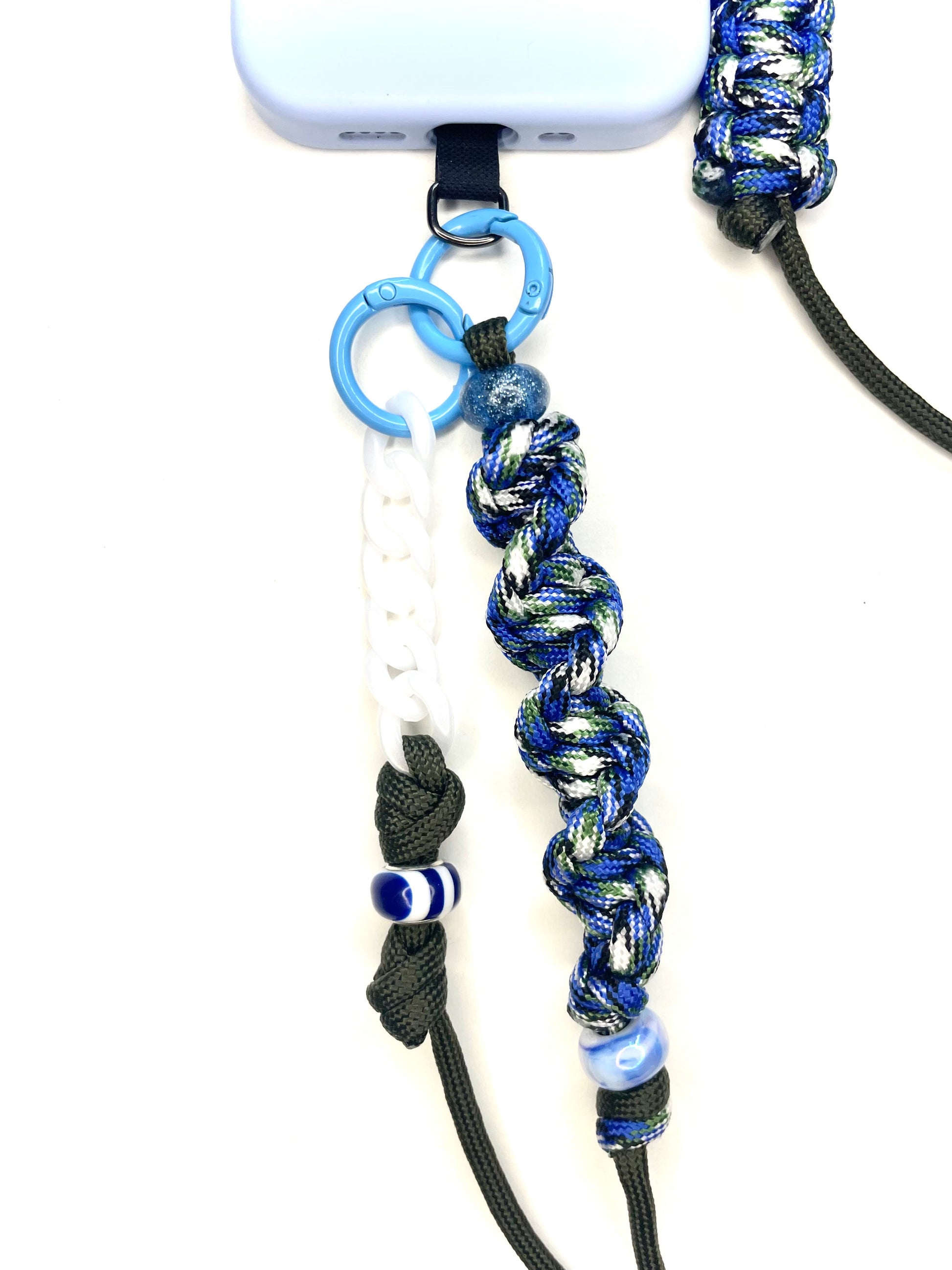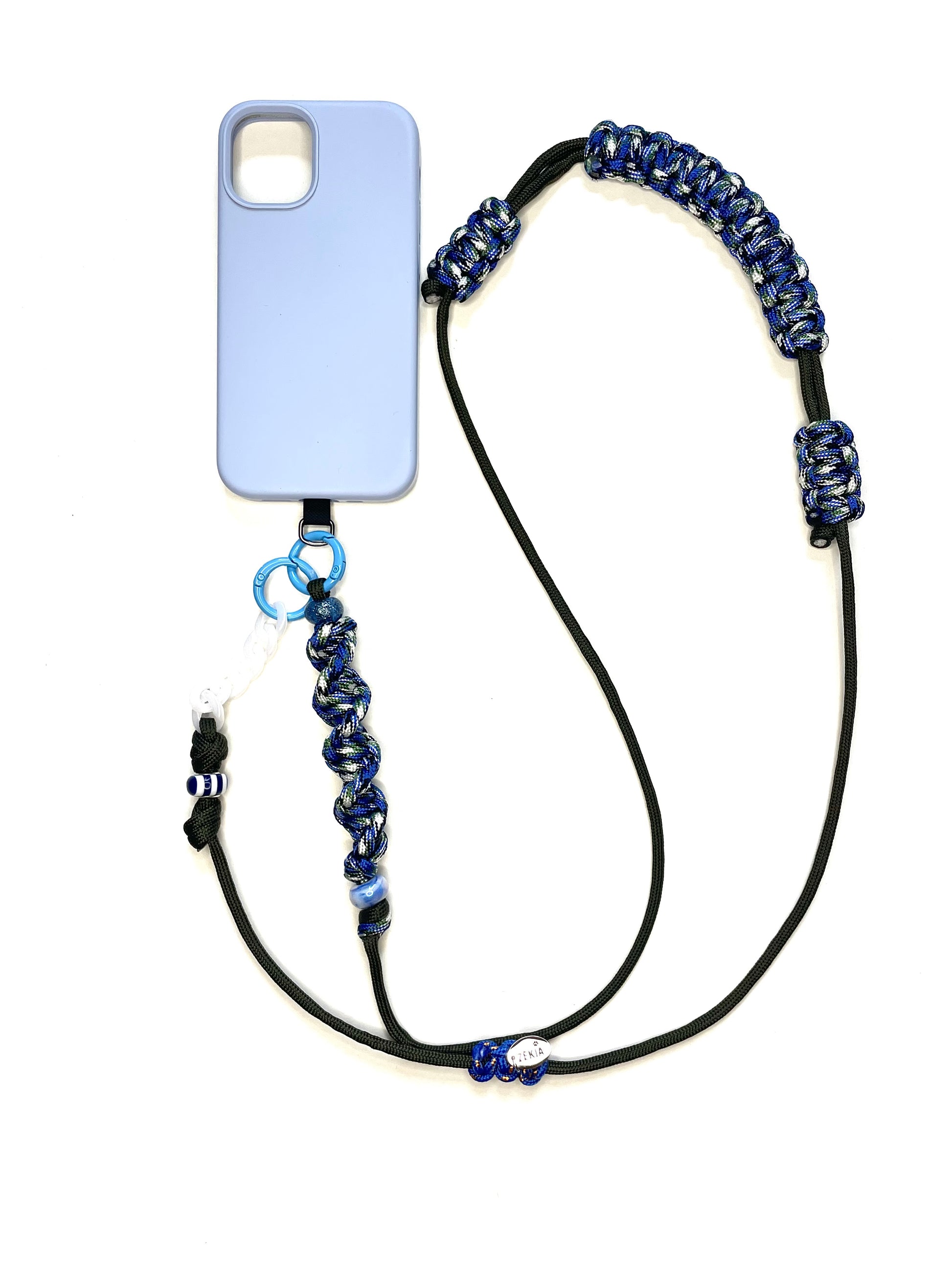 La profondeur d'un bleu océan, mêlé à un noir intense, réveillé par des éclats blancs lumineux et un kaki puissant. Un cordon de téléphone ajustable, tressé à la main, pour un style mystérieux et affirmé.