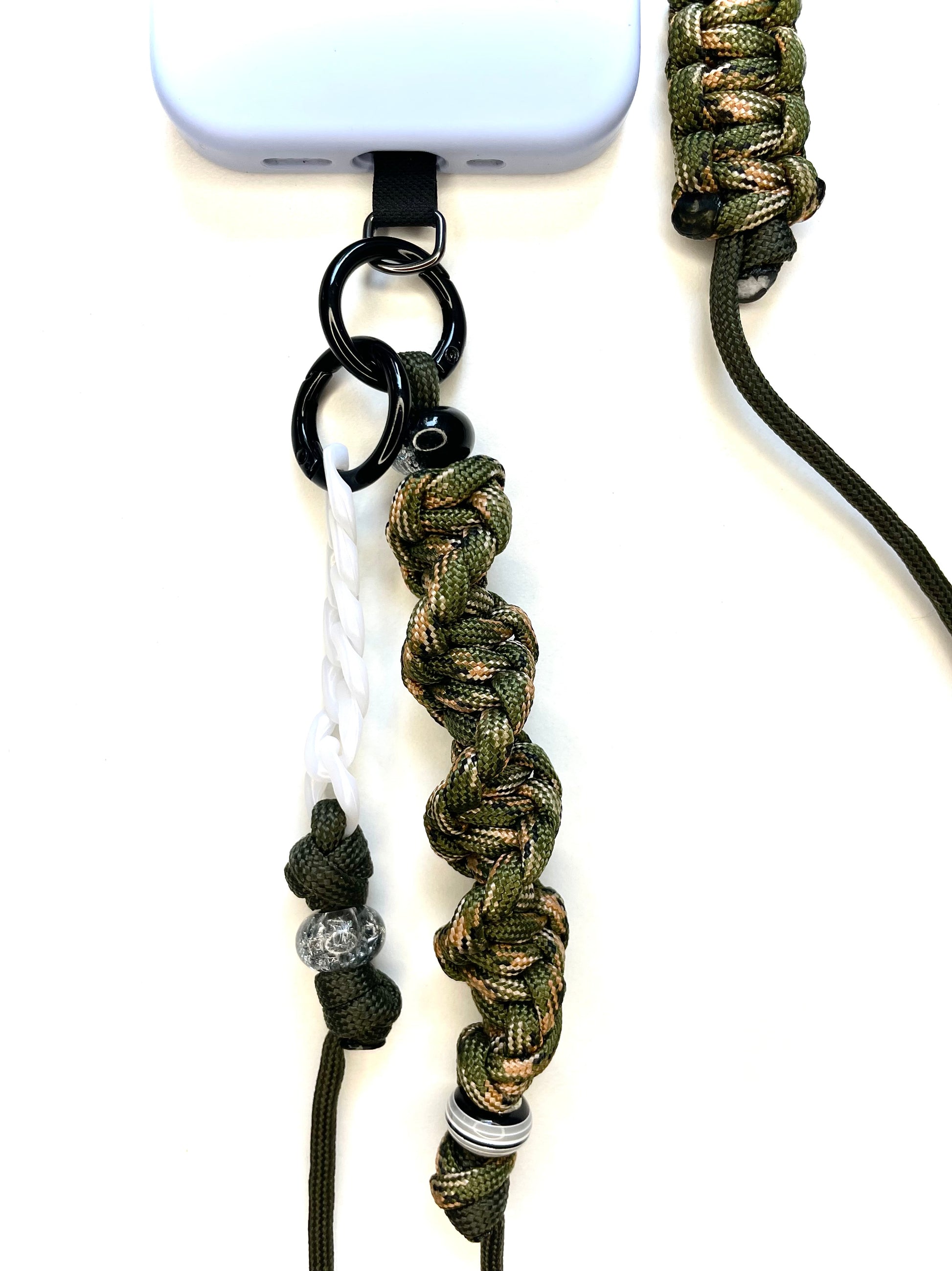 L'intensité brute d'un vert kaki profond adoucie par la sobriété d'un beige naturel. Un cordon de téléphone ajustable, tressé à la main, pour un style sobre et intemporel.