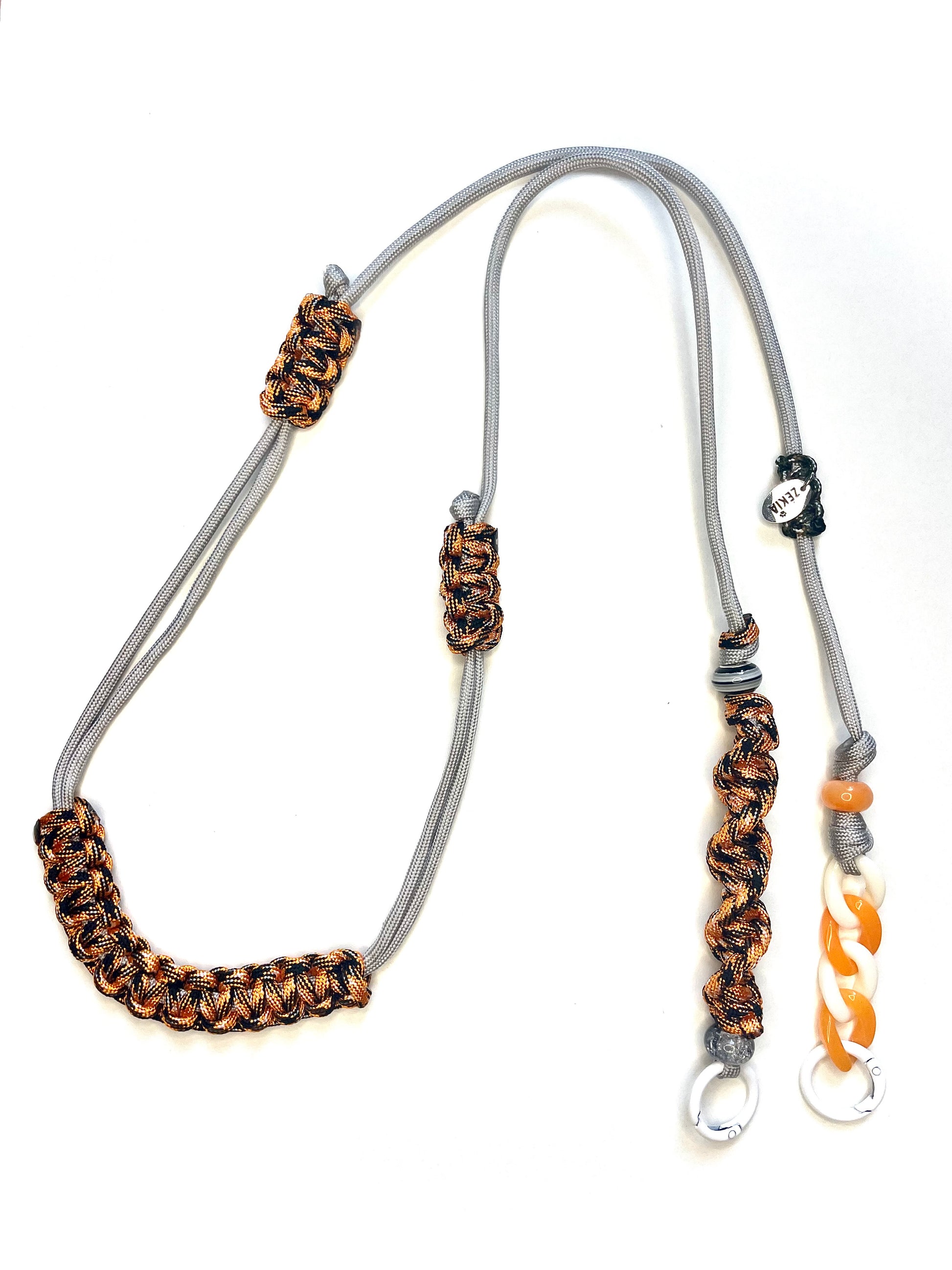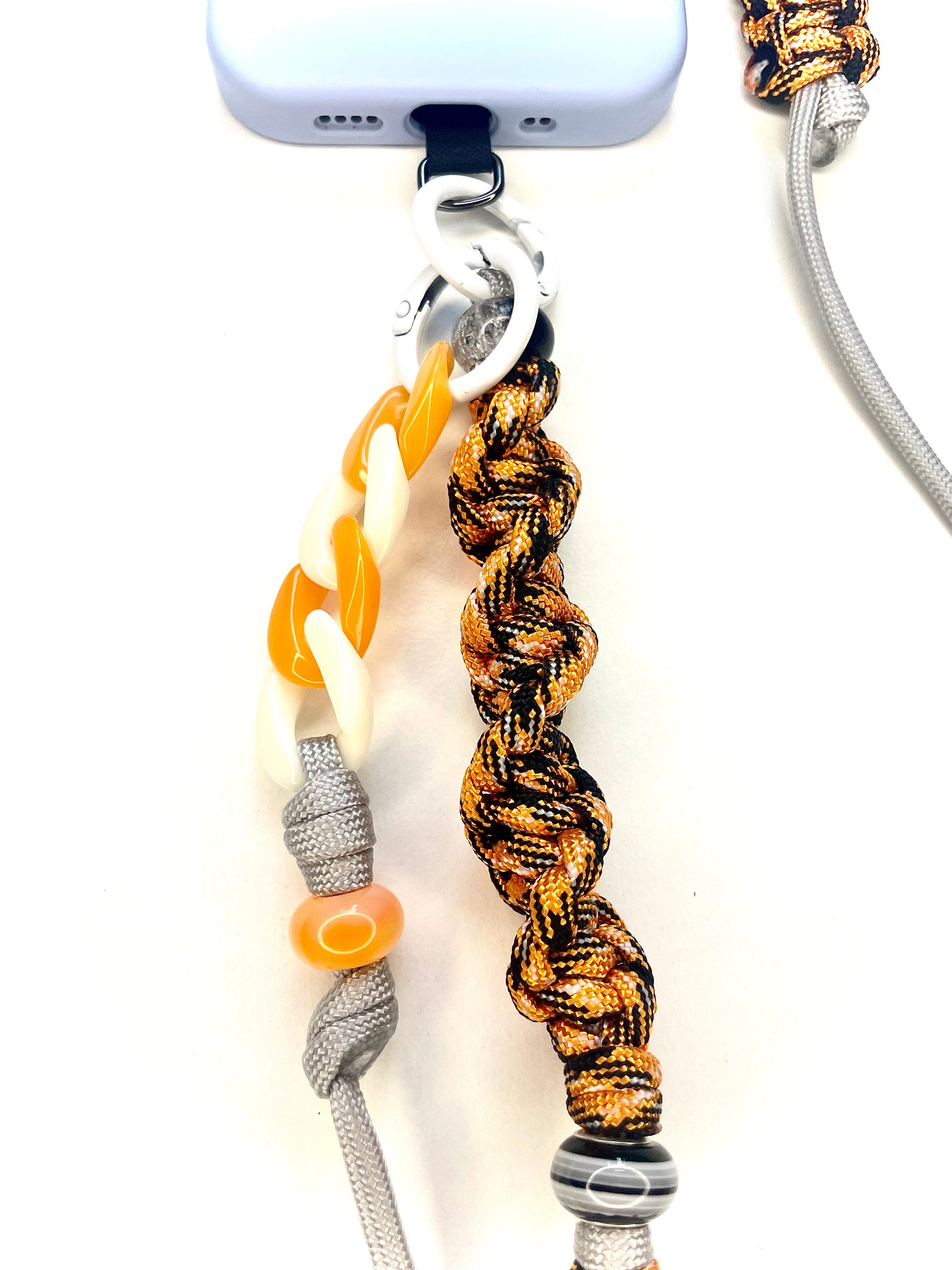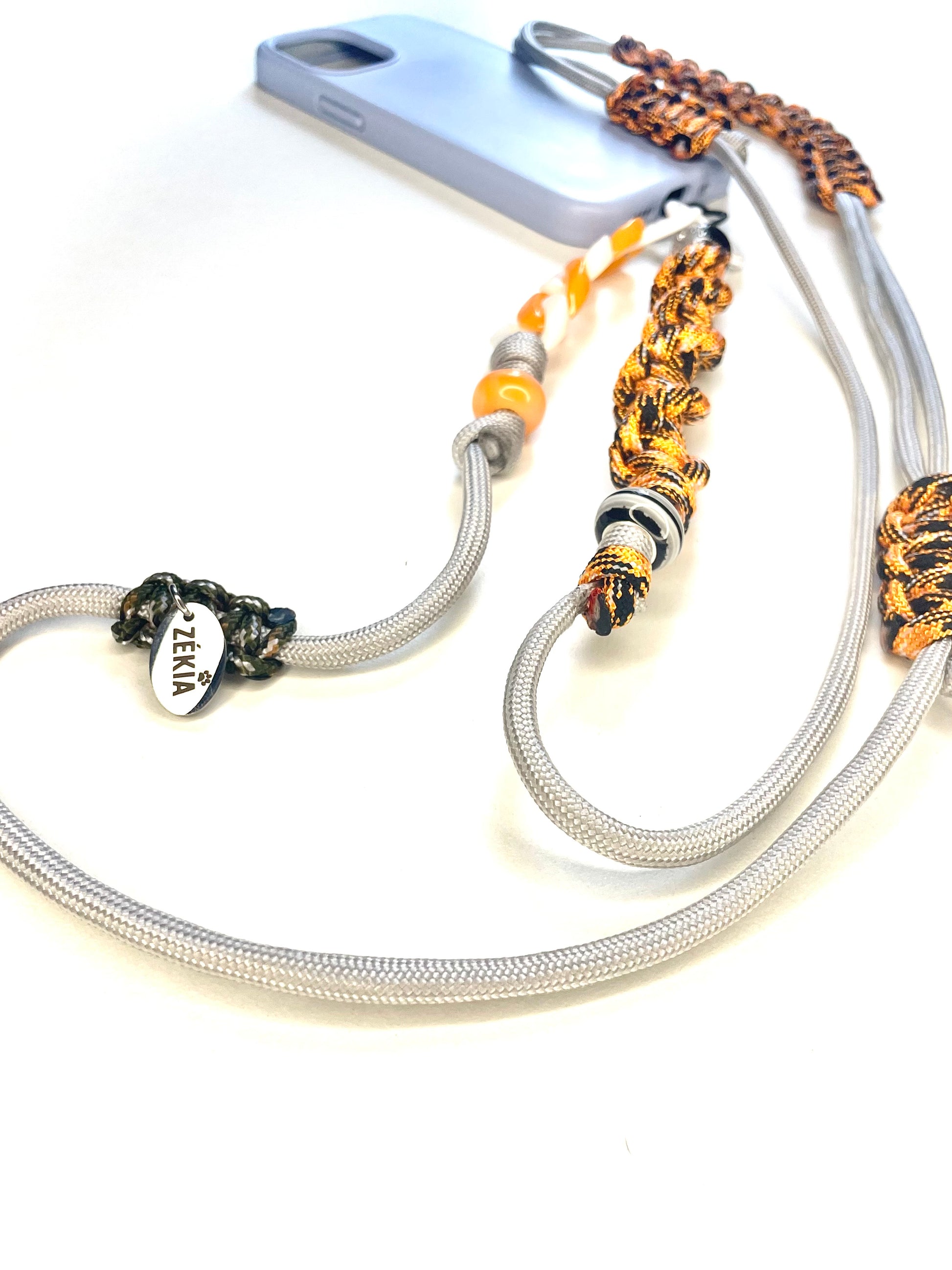 Un gris minéral qui croise un orange incandescent, et s'ancre dans la puissance d'un noir profond. Un cordon de téléphone en paracorde, unique et artisanale, pensé pour un style affirmé et plein de panache.