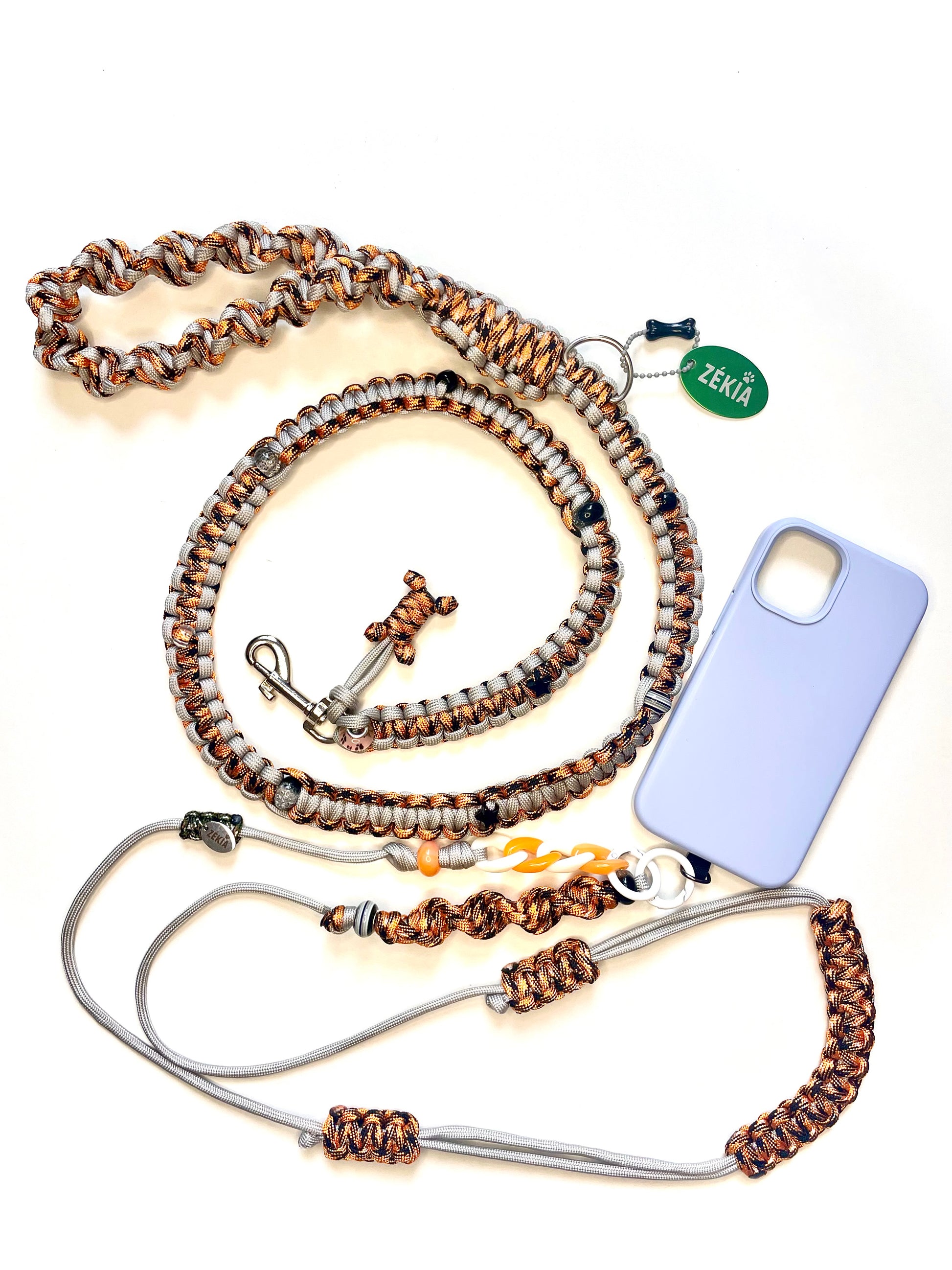 Pensés comme de véritables pièces de duo, les cordons de téléphone ZÉKIA s'accordent avec les laisses et charms assortis. Un concept matchy-matchy unique : un lien tissé qui affiche, avec style, la complicité entre vous et votre chien.