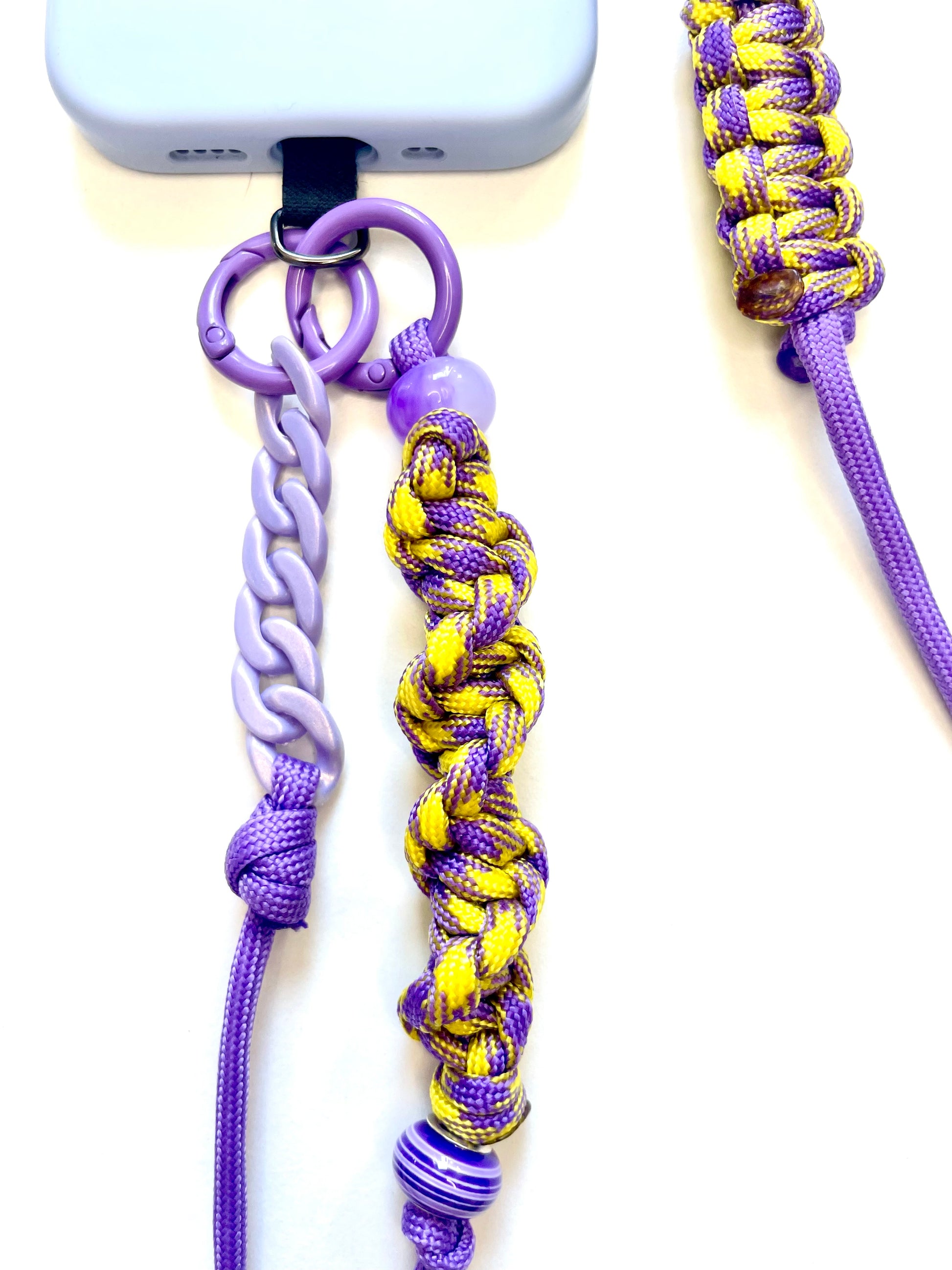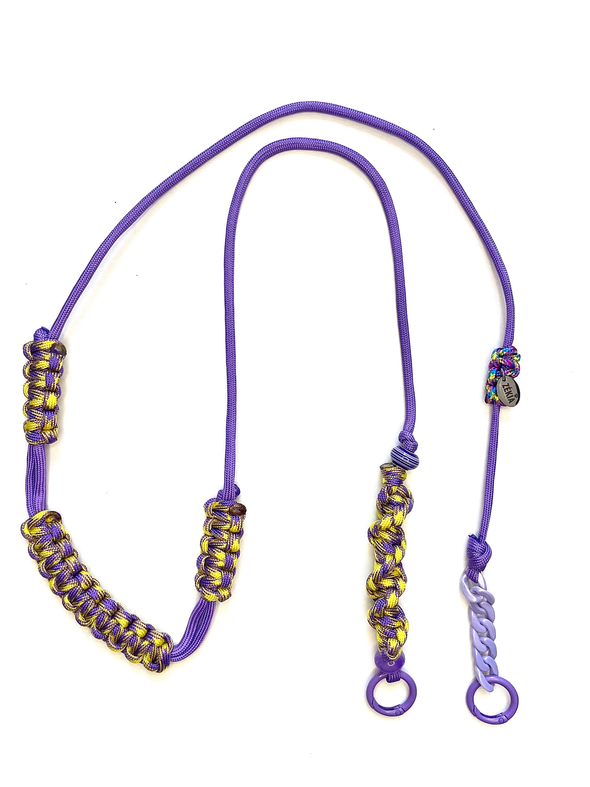 Le battement vif d'un violet électrique qui se mêle à l'intensité solaire d'un jaune éclatant. Un cordon de téléphone en paracorde, unique et artisanale, pensé pour un style lumineux et plein d'éclat.