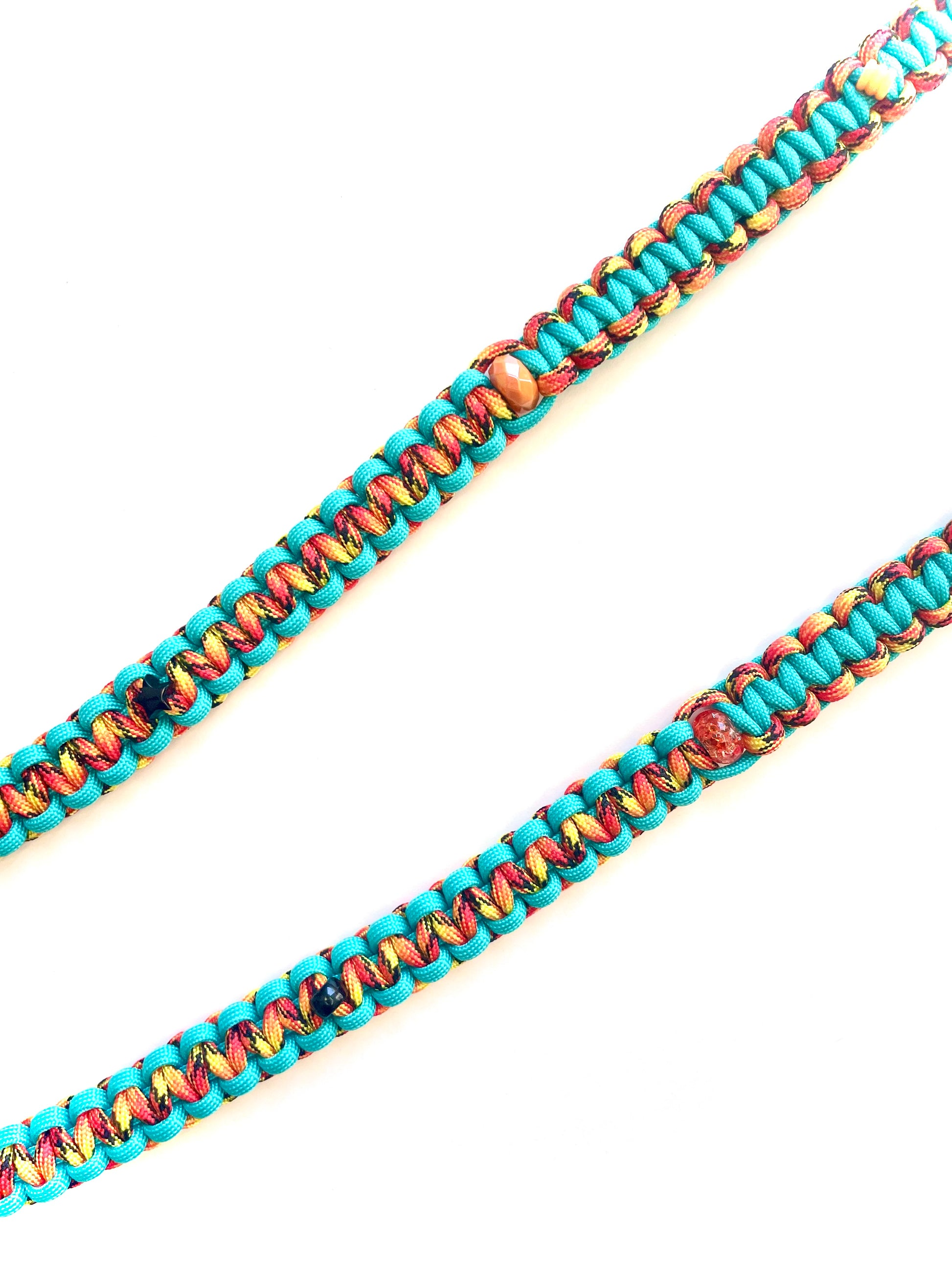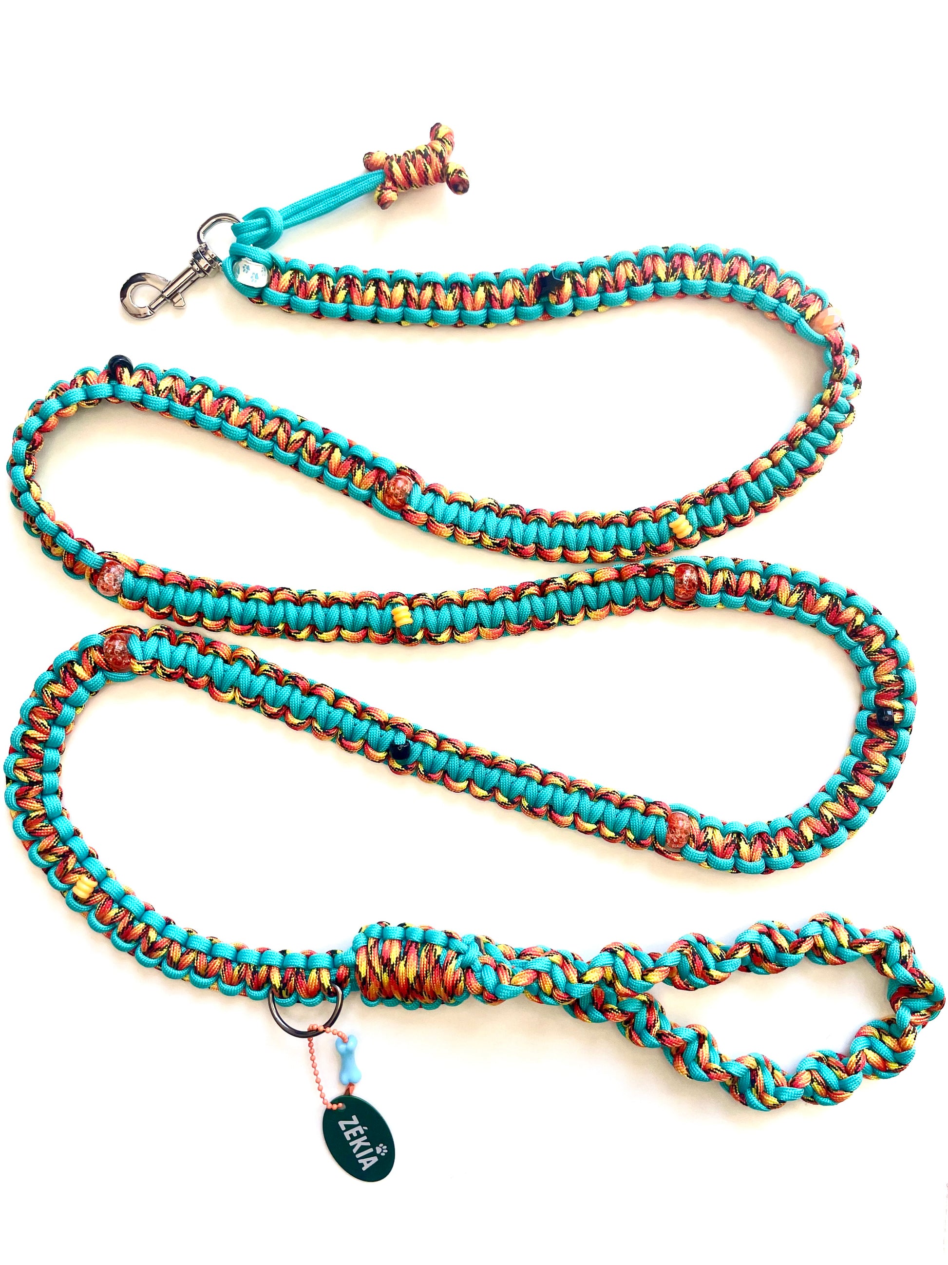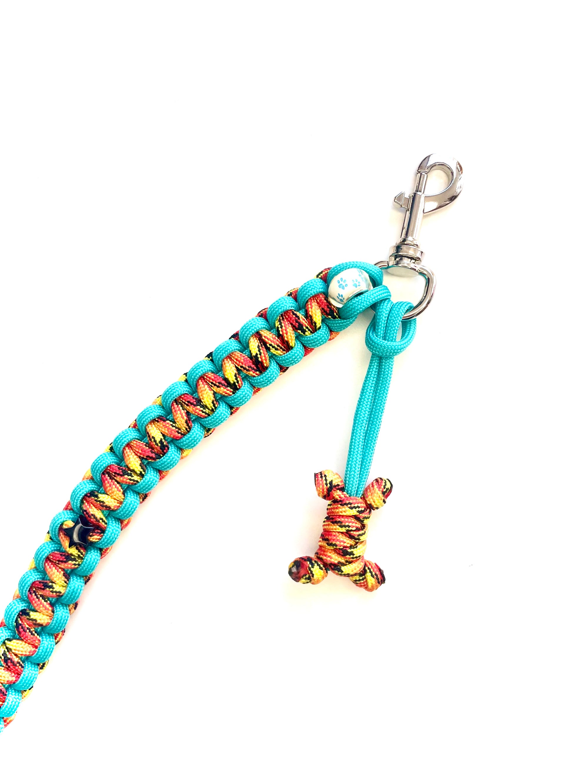 Caribbean Fire - l'éclat d'un turquoise vibrant mêlé à des flammes oranges comme un coucher de soleil tropical. Une laisse artisanale, pensée pour un duo solaire et plein de tempérament.
