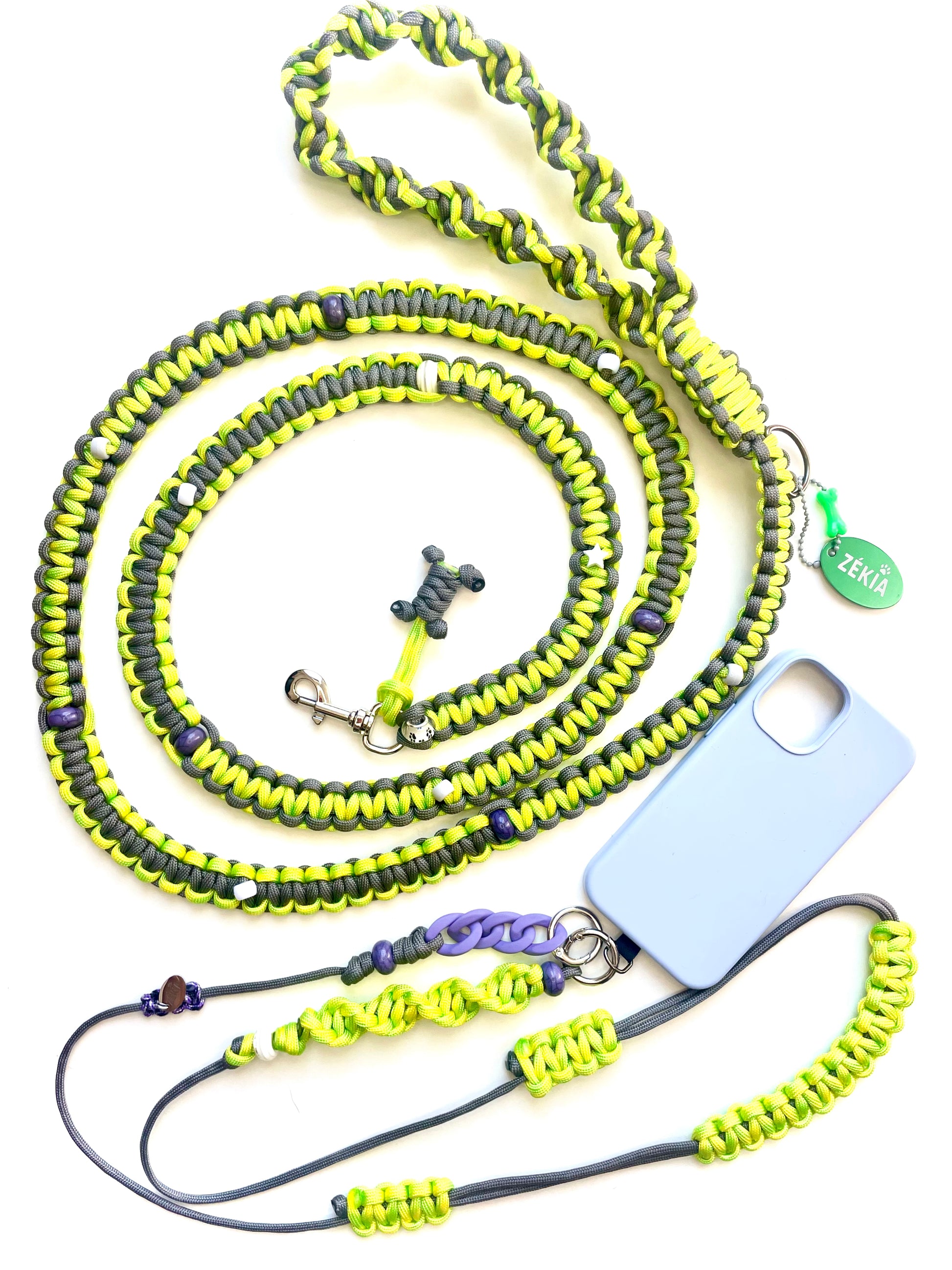 Pensées comme de véritables pièces de duo, les laisses ZÉKIA s'accordent avec les cordons de téléphone et charms assortis. Un concept matchy-matchy unique : un lien tissé qui affiche, avec style, la complicité entre vous et votre chien.