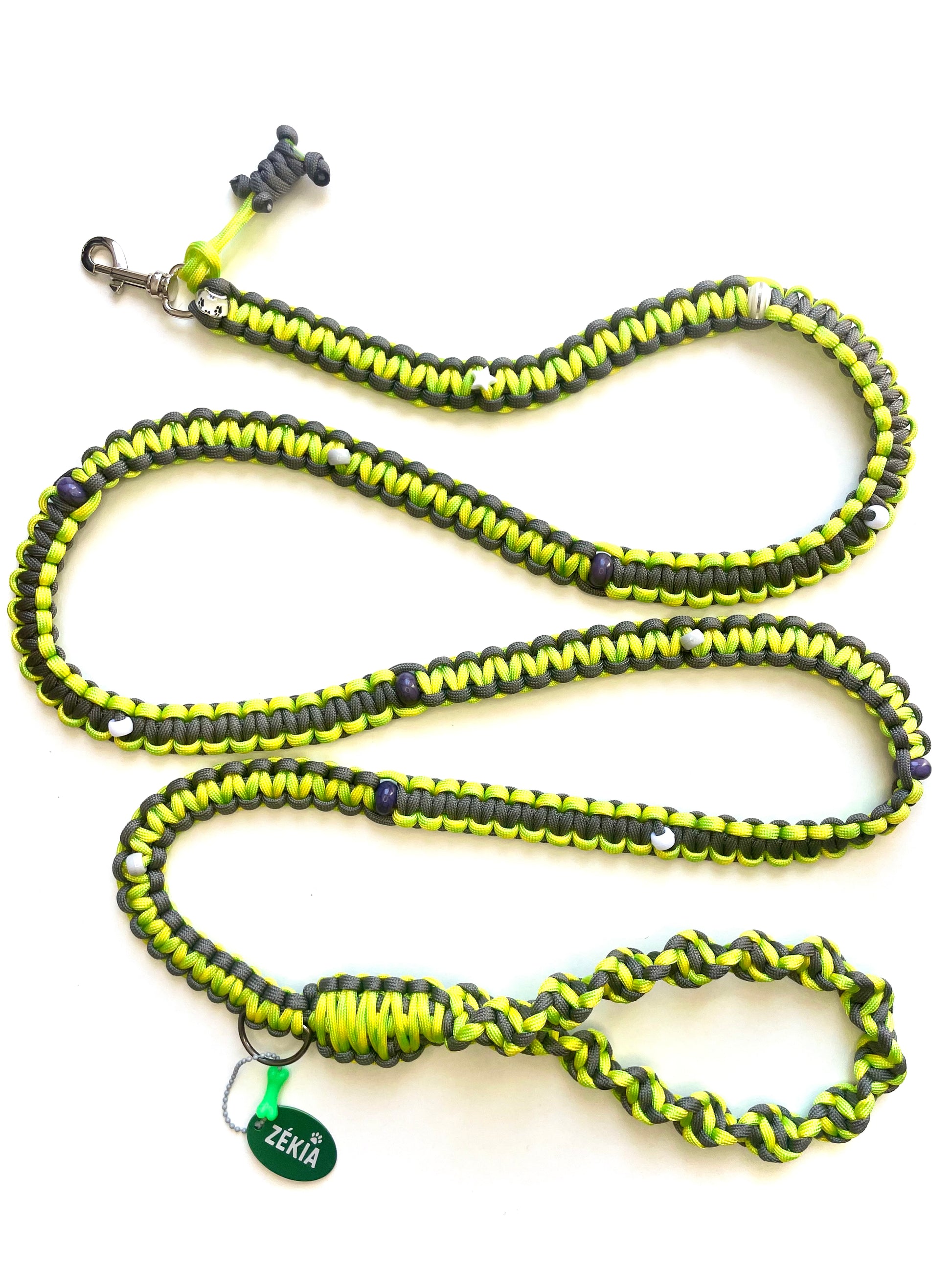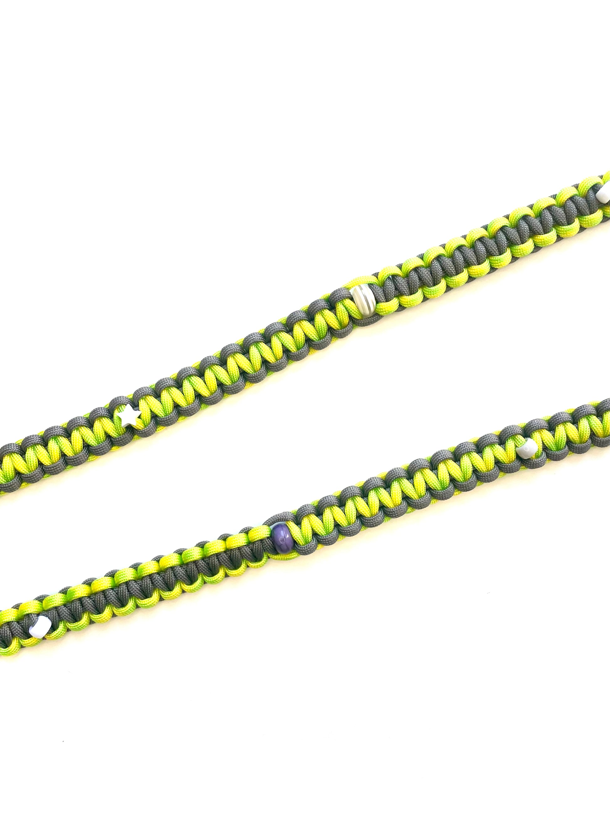 Néon Style - le contraste d'un gris acier et de touches fluorescentes, pour une énergie vibrante. Une laisse artisanale, pensée pour un duo indomptable et plein d'intensité.