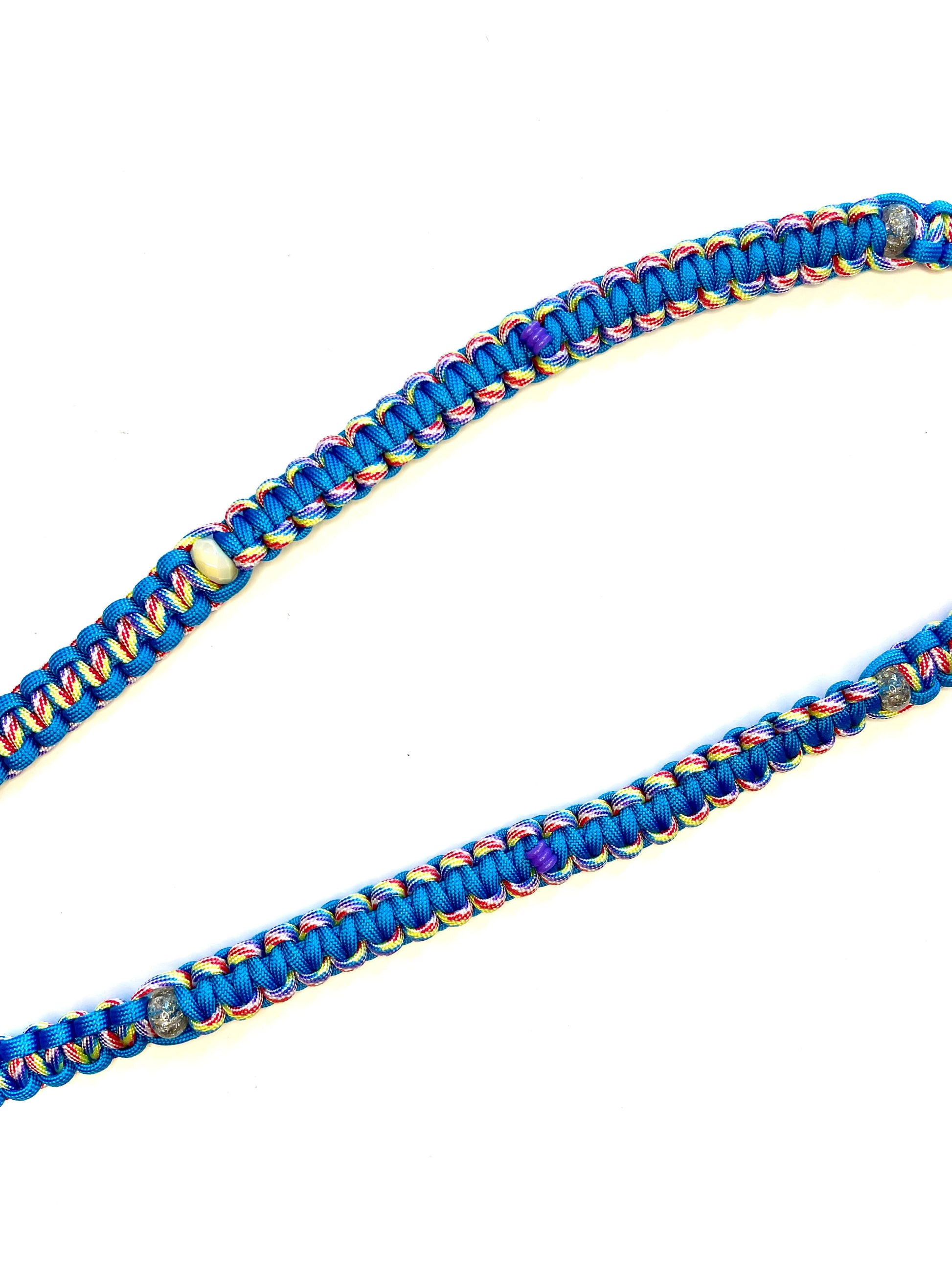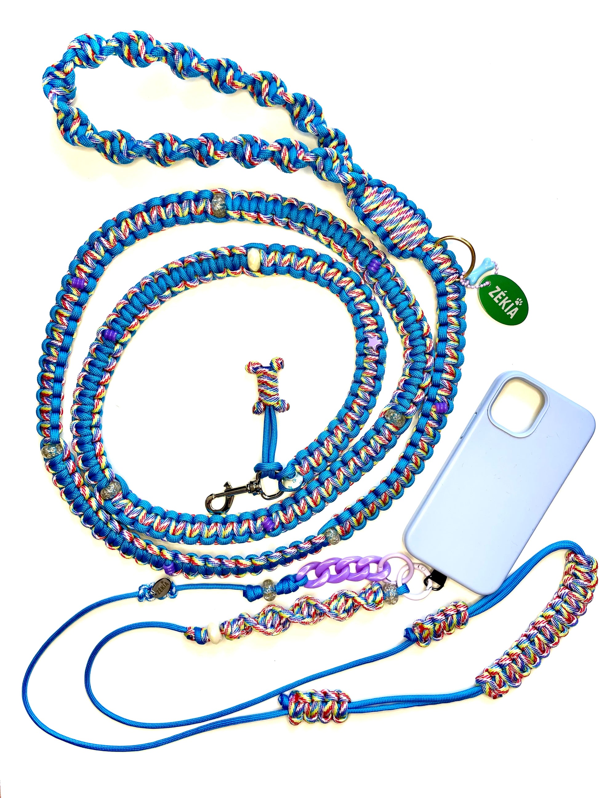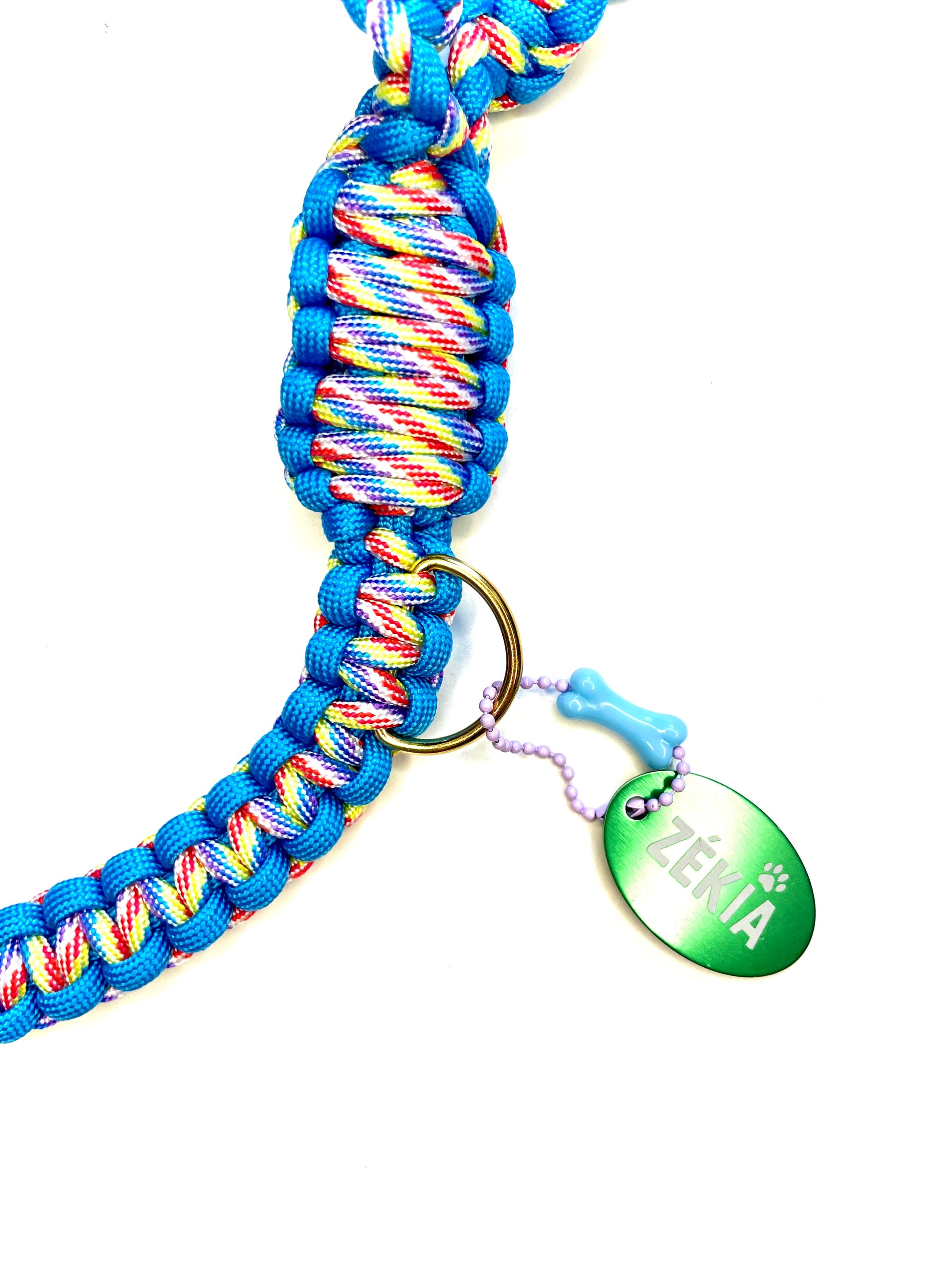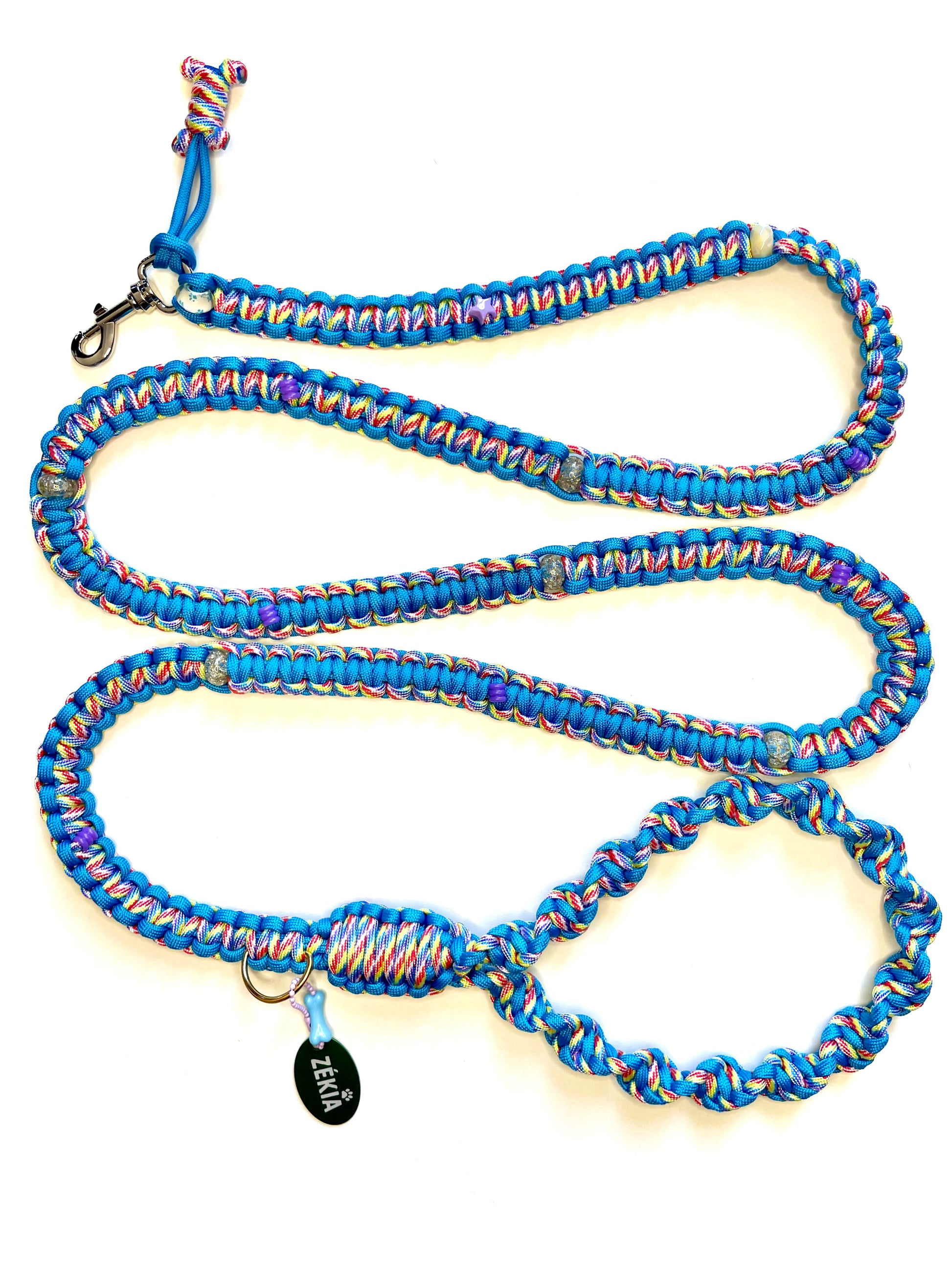 Rainbow Splash - l'éclat d'un bleu azur illuminé de touches multicolores, comme un arc-en-ciel. Une laisse artisanale, pensée pour un duo pétillant et plein de bonne humeur.