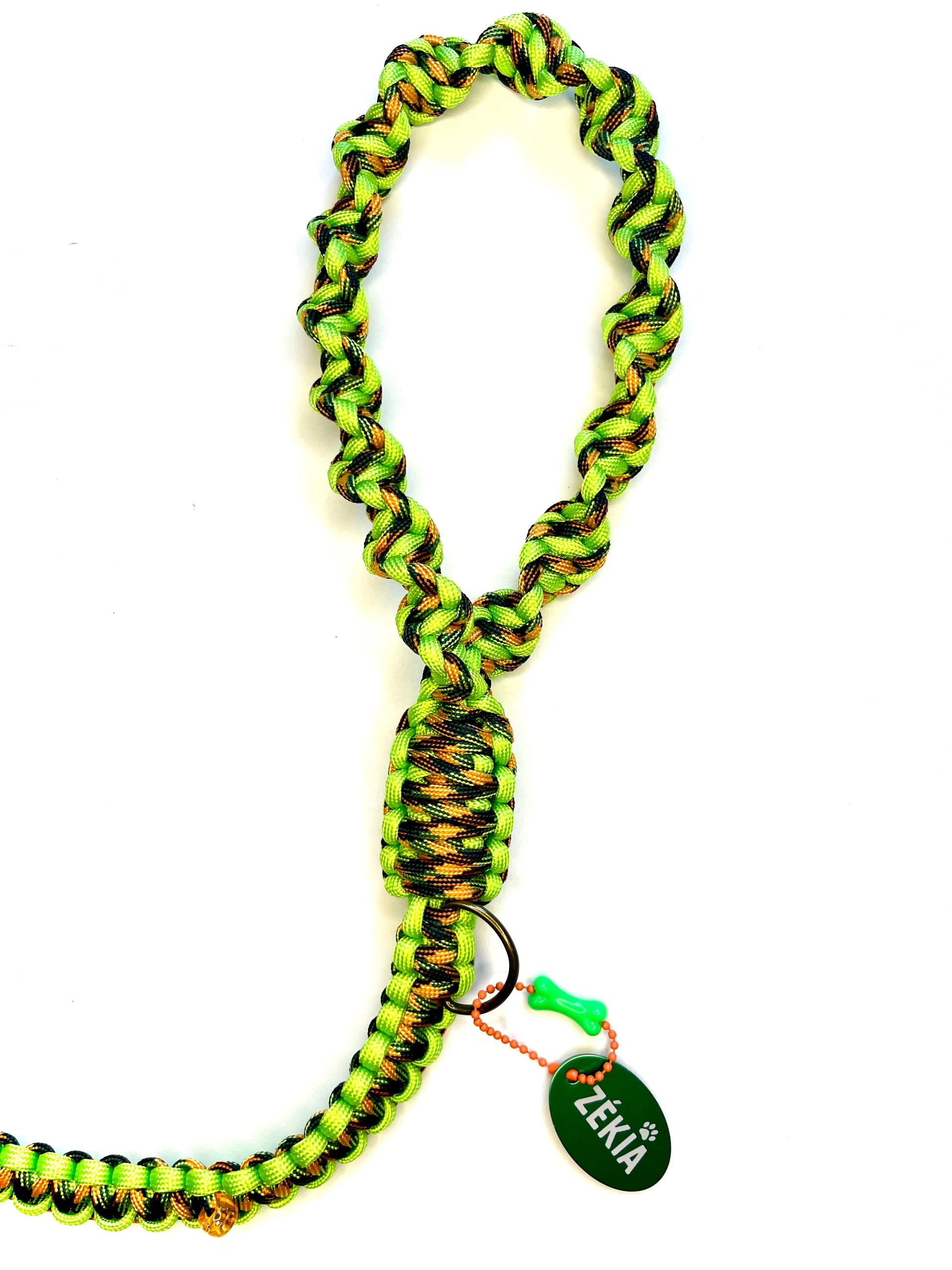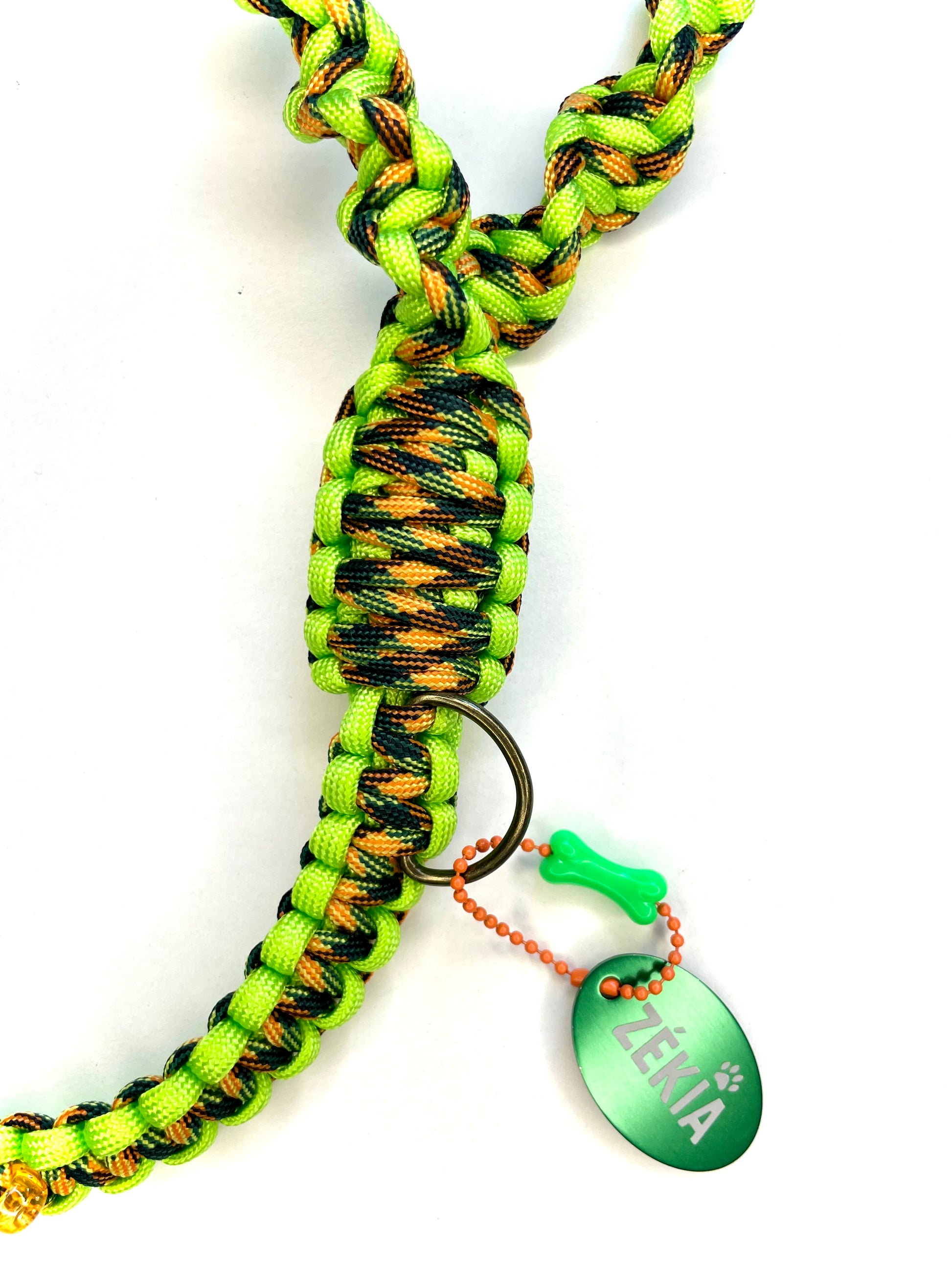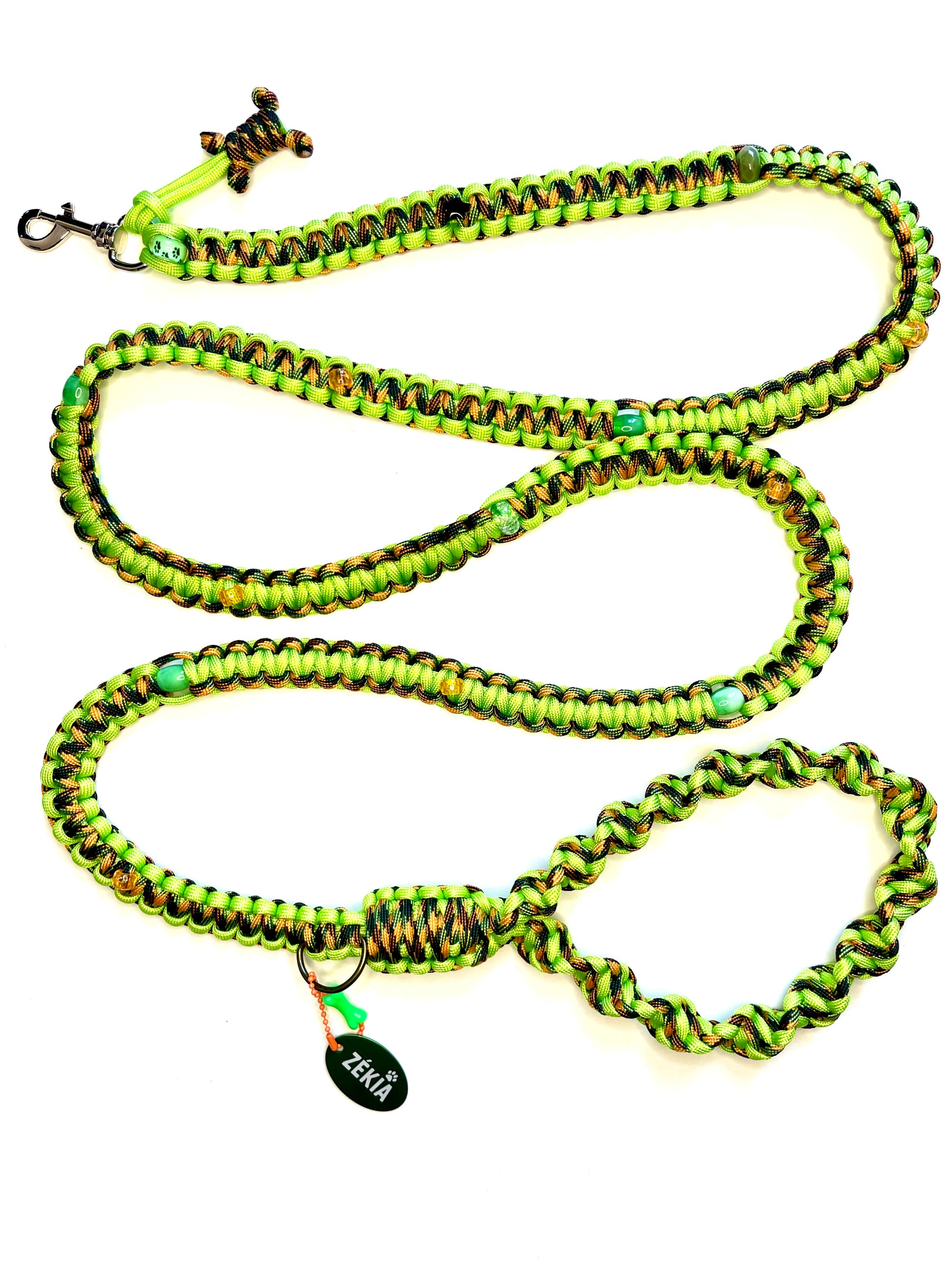 Wild Track - la fougue d'un vert acide relevé de touches kaki et d'éclats orangés brûlants. Une laisse artisanale, pensée pour un duo aventurier et plein de vitalité.