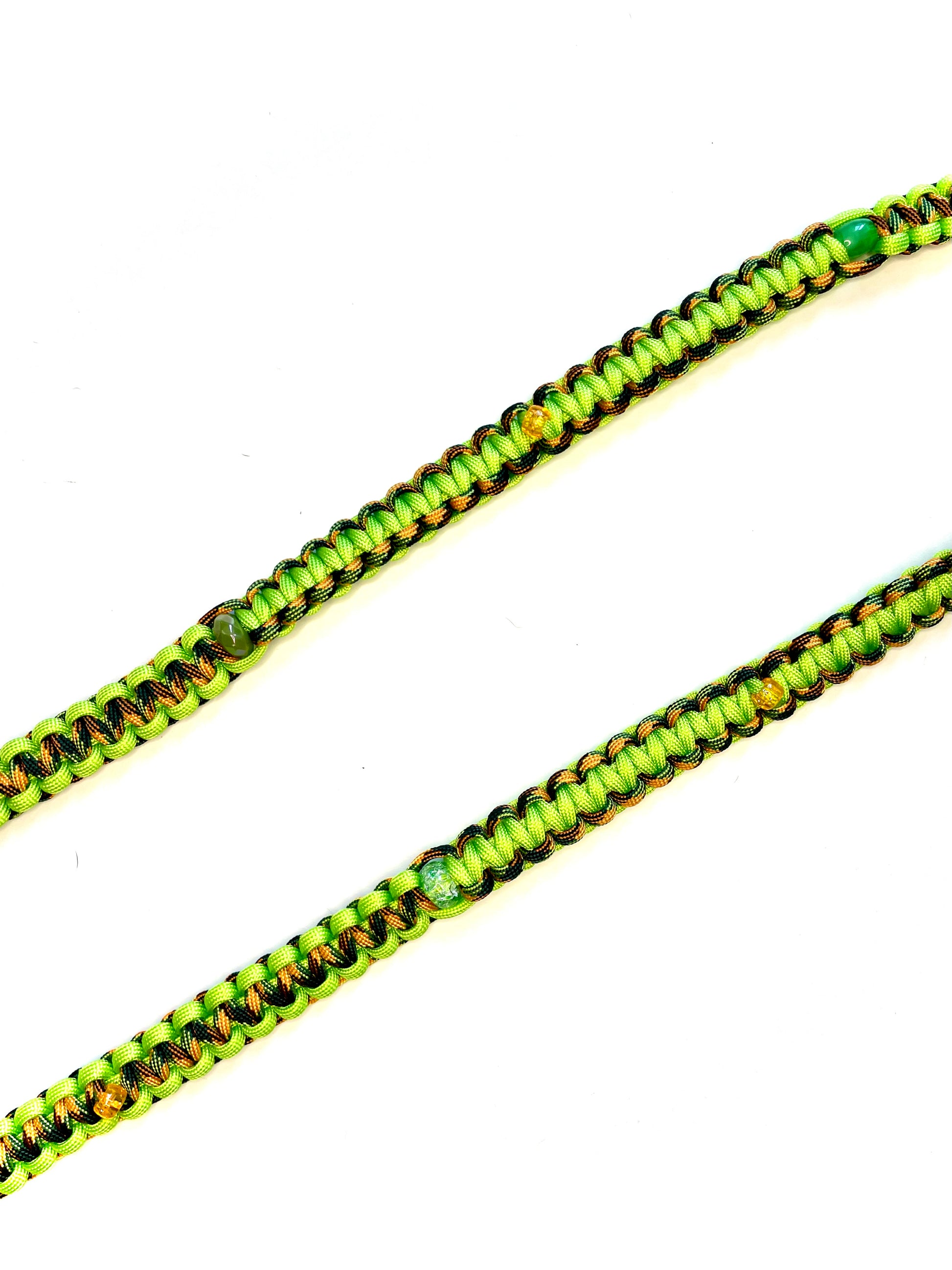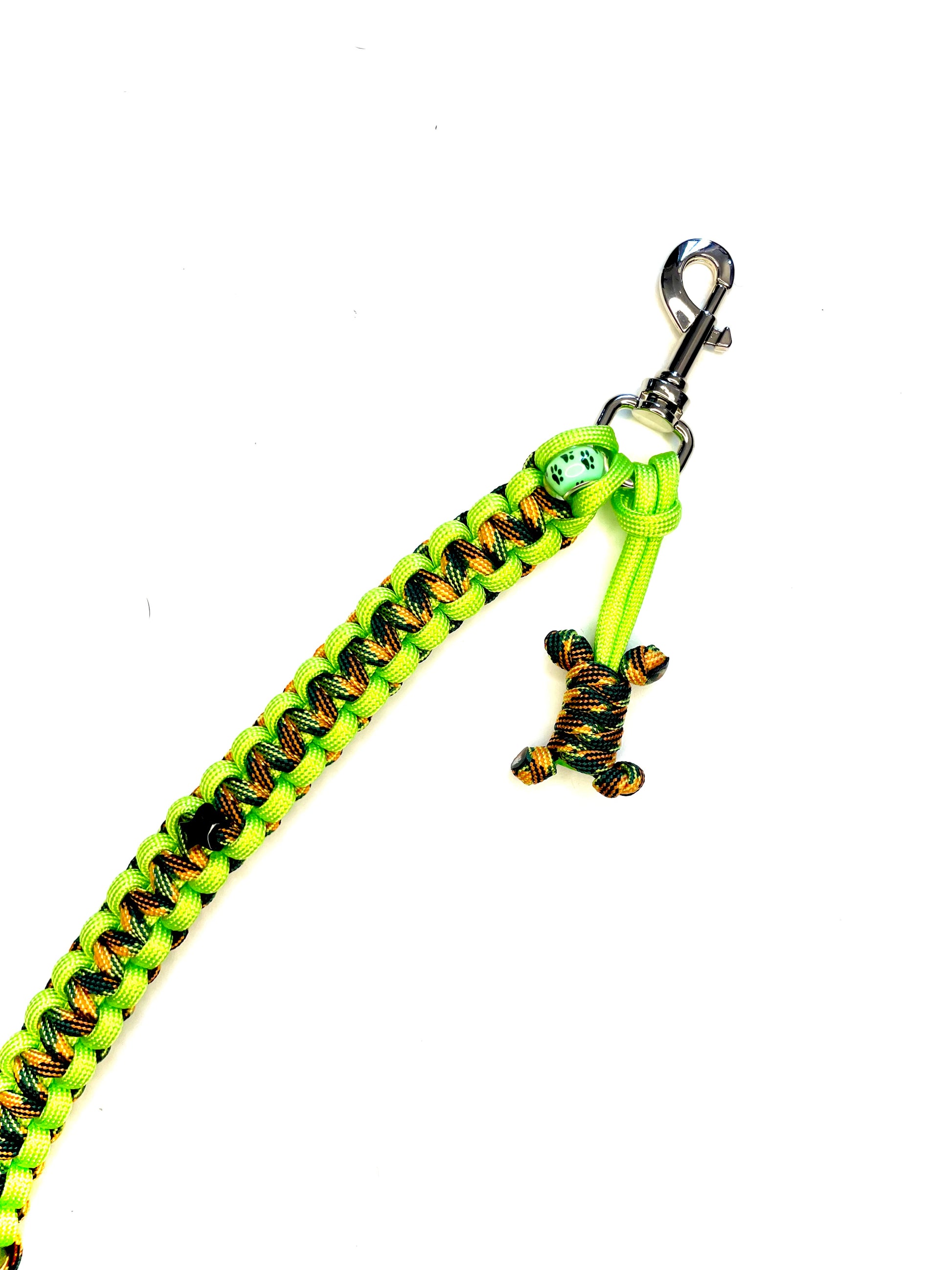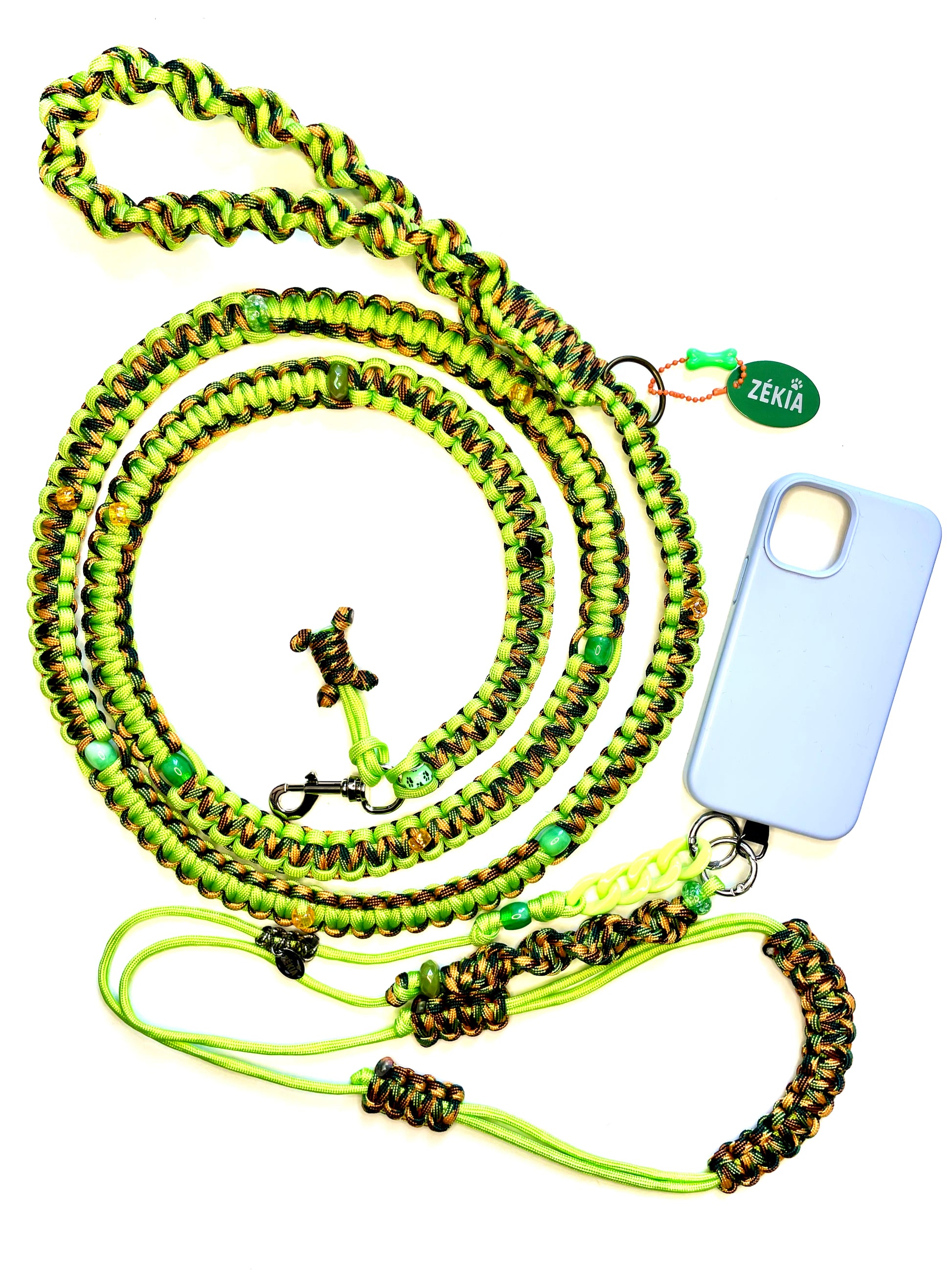 Wild Track - la fougue d'un vert acide relevé de touches kaki et d'éclats orangés brûlants. Une laisse artisanale, pensée pour un duo aventurier et plein de vitalité.