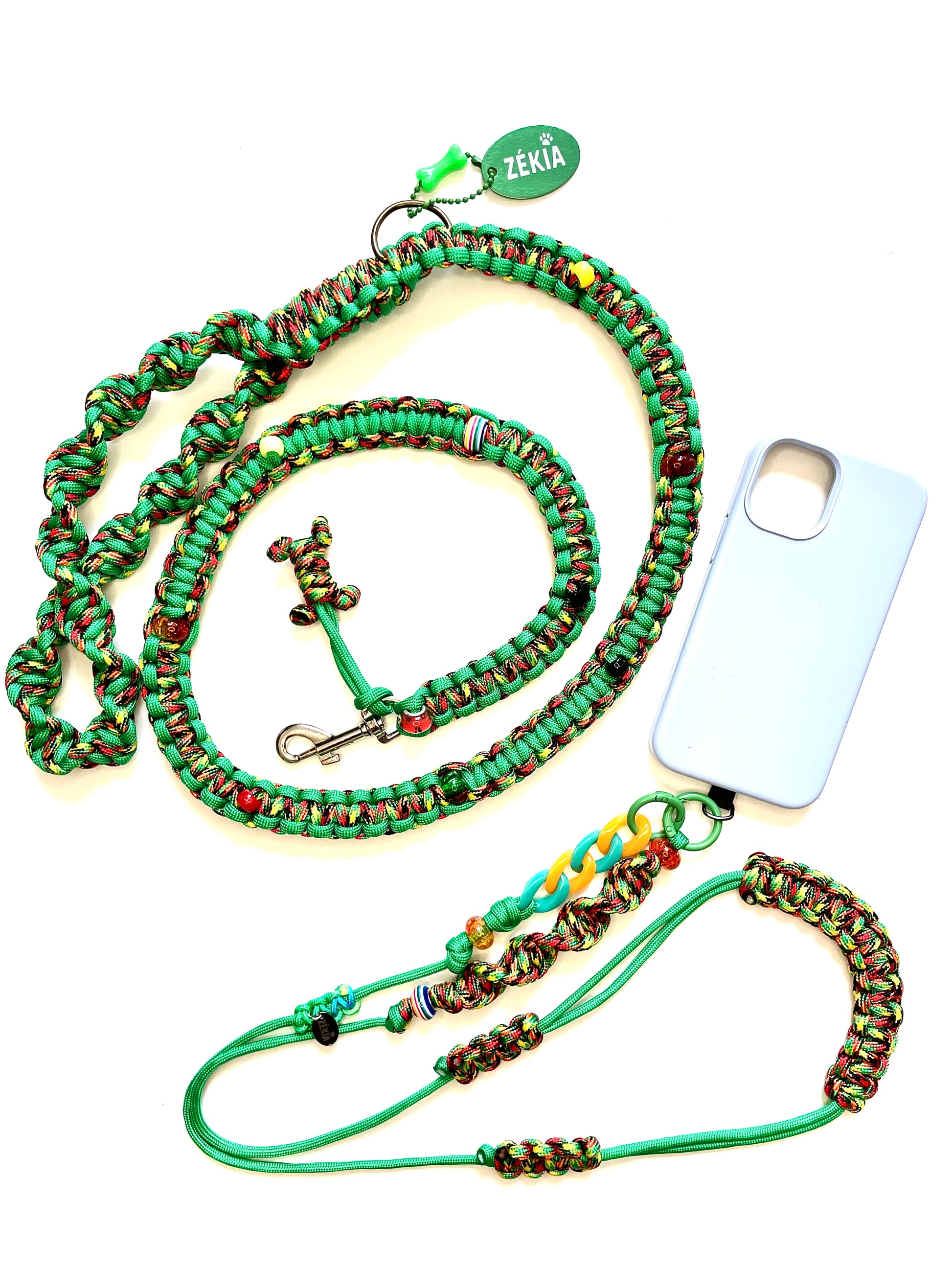 Rasta Flow - un vert vibrant porté par la chaleur du rouge et l'énergie solaire du jaune reggae. Une laisse artisanale, pensée pour un duo affirmé, solaire et plein de good vibes.