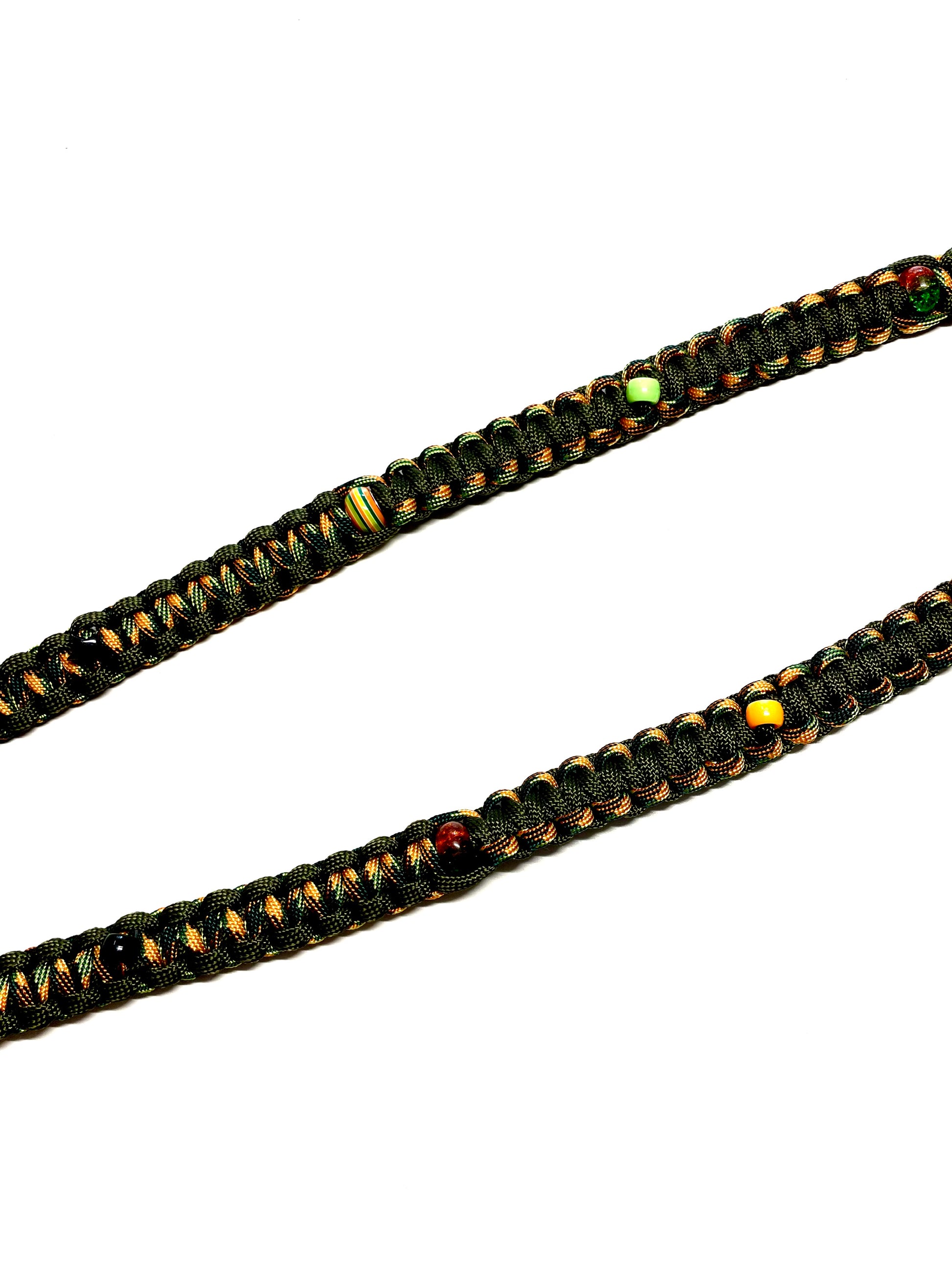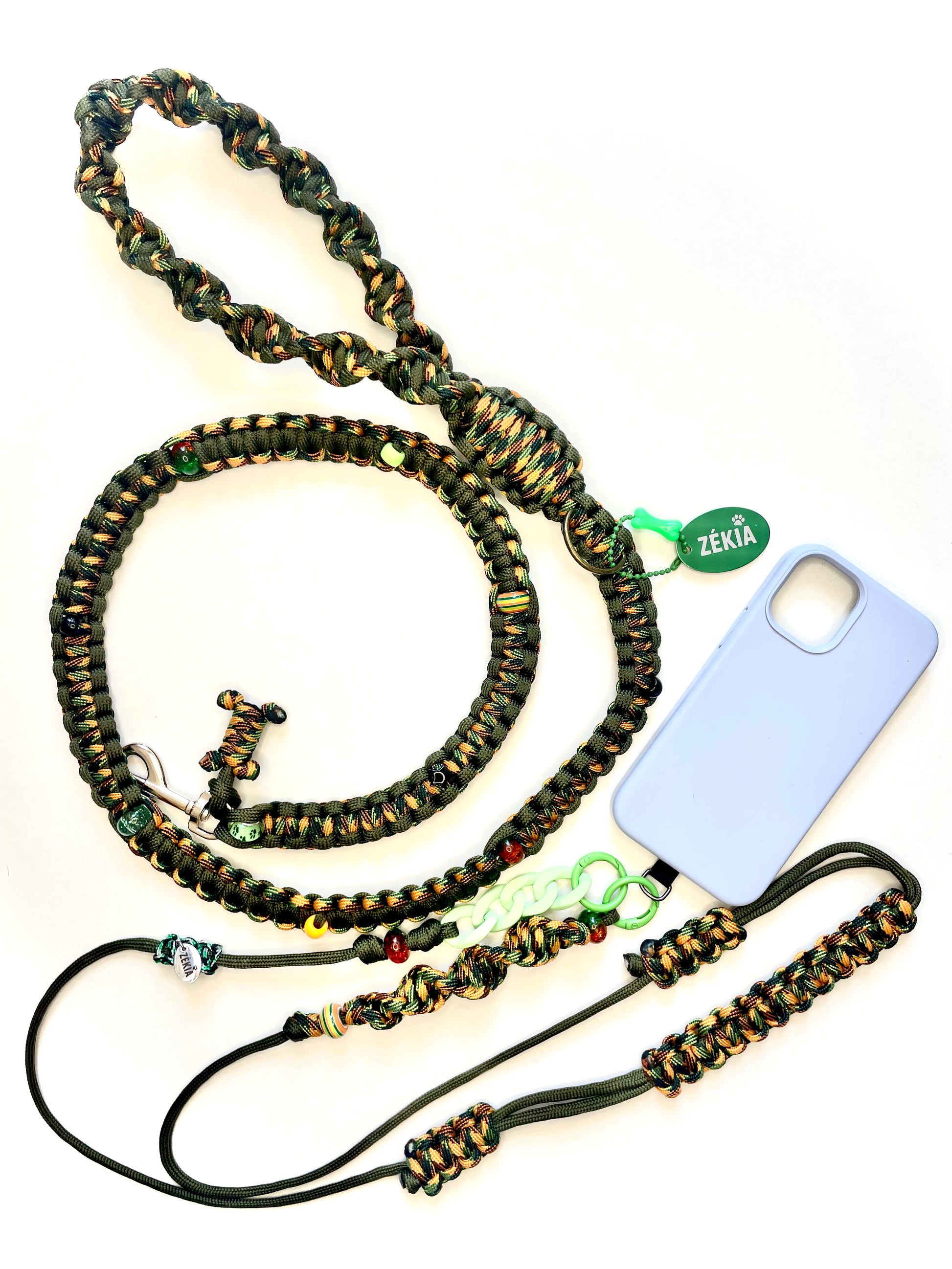 Savage Roots - un vert kaki profond relevé d'éclats d'orange et de nuances sombres. Une laisse artisanale, pensée pour un duo aventurier et plein de caractère.