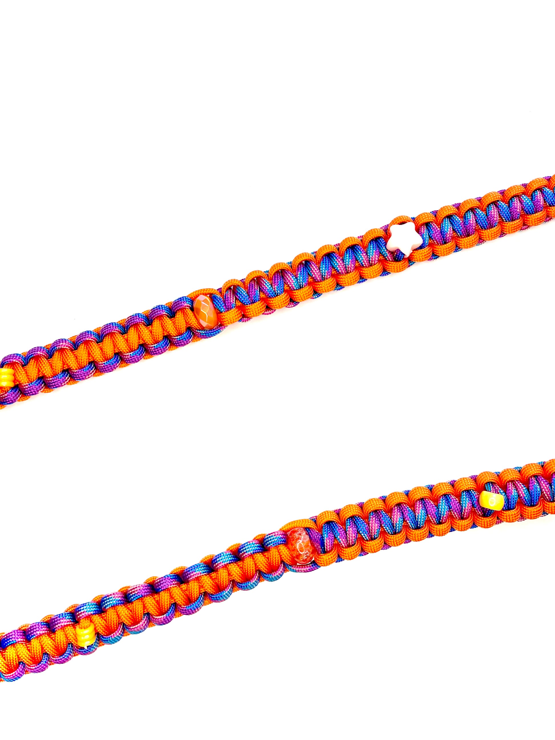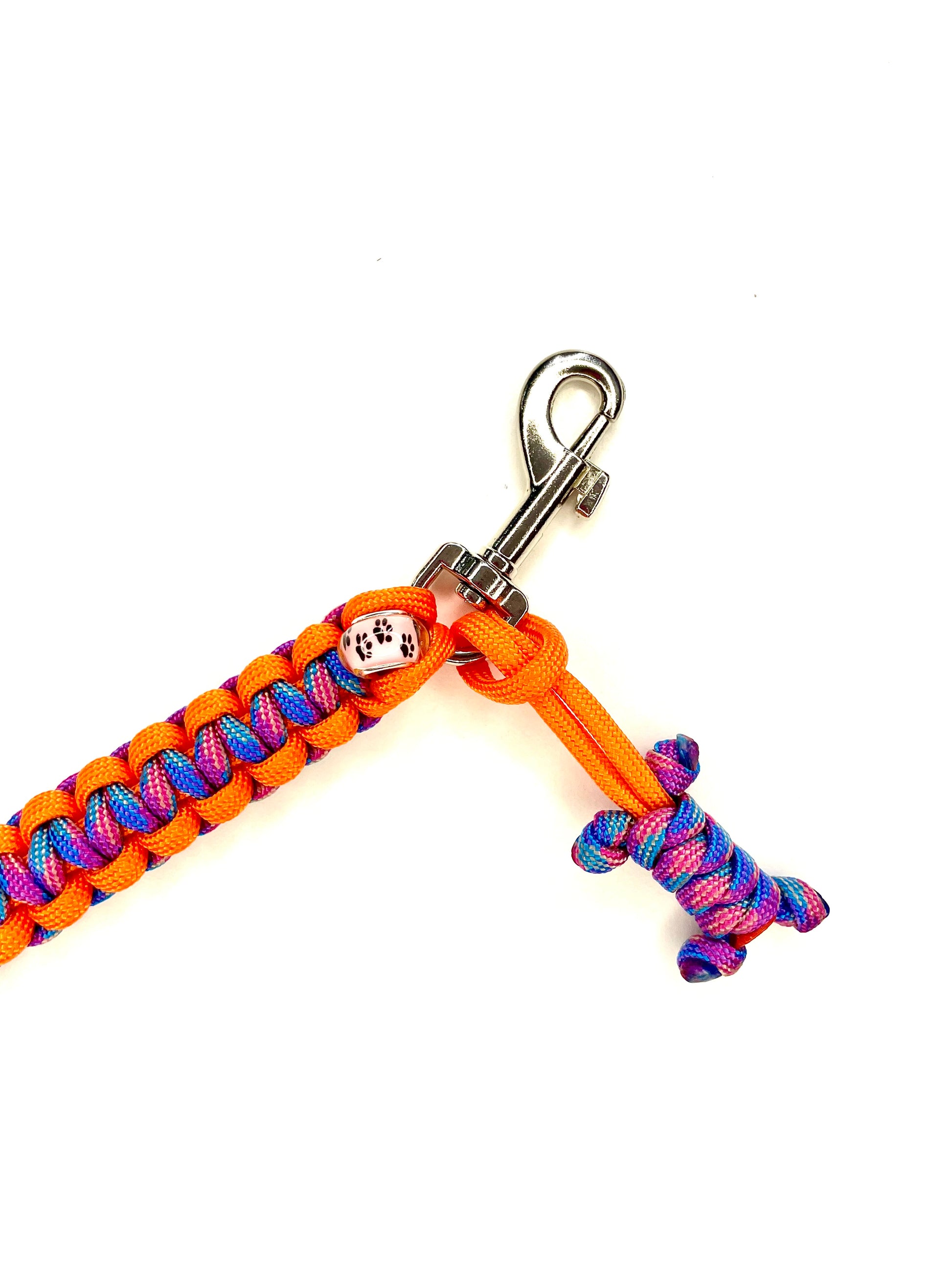 Sunset Pop - un orange vitaminé fusionné à un violet pop et un bleu électrique, comme un coucher de soleil éclatant. Une laisse artisanale, pensée pour un duo joyeux et plein de peps.