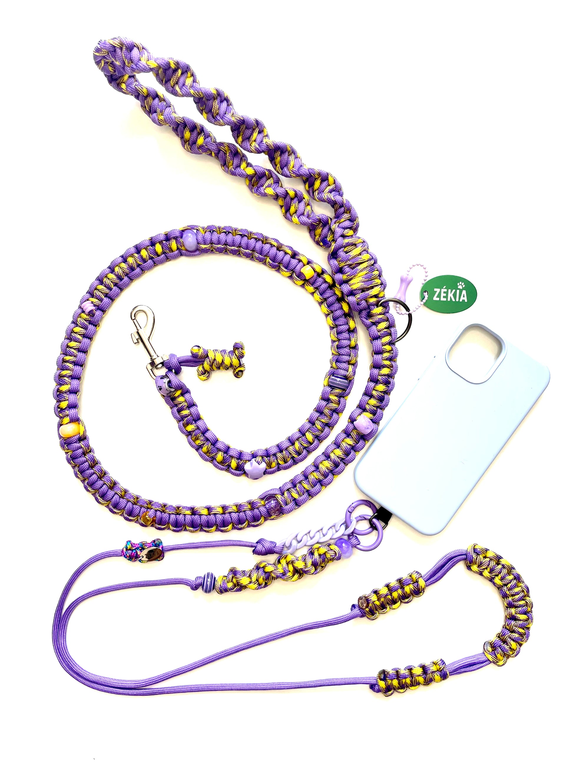 Pensées comme de véritables pièces de duo, les laisses ZÉKIA s'accordent avec les cordons de téléphone et charms assortis. Un concept matchy-matchy unique : un lien tissé qui affiche, avec style, la complicité entre vous et votre chien.